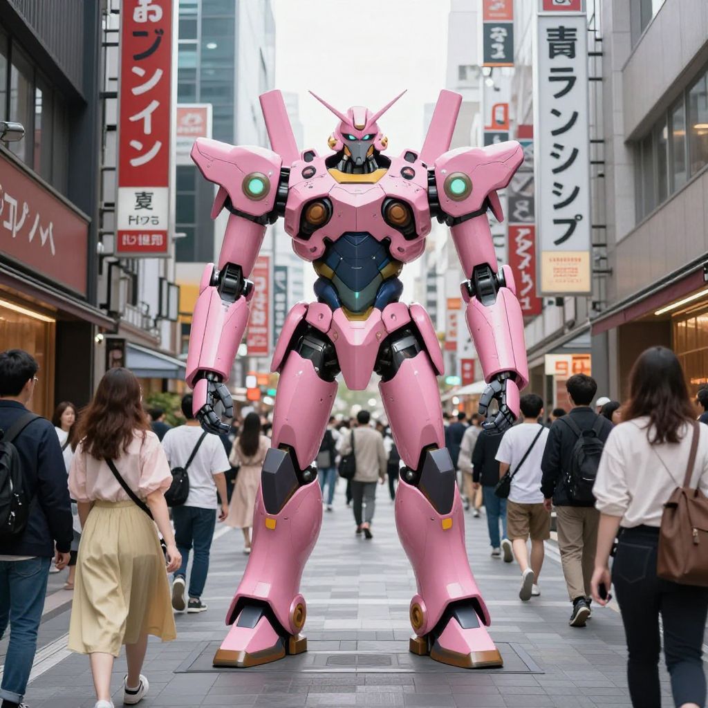 Photograph of a towering pink mech robot standing in a busy Japanese city street, surrounded by pedestrians in modern attire.