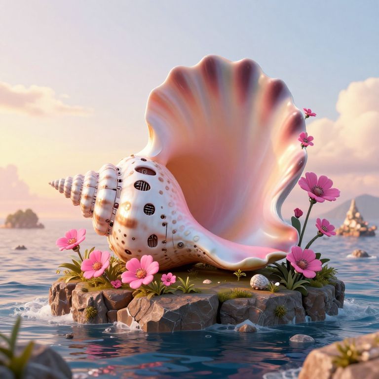 A vibrant, digital CGI image of a large, pink and white seashell with a spiral shell and pitted surface, resting on a rocky island in a serene ocean. The island is adorned with pink flowers and green plants. The background features a calm, blue ocean with distant, slightly blurred islands under a pastel-colored, sunset sky. The seashell's texture is smooth with a glossy finish, and its interior is illuminated, highlighting its large, fan-shaped opening. The scene is whimsical and fantasy-like, with a playful, dreamy atmosphere.