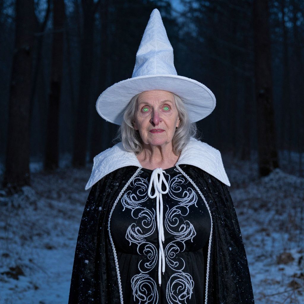A realistic photo of an elderly woman in a snow white witch costume, with a wrinkled face, grey hair, and a hooked nose, wearing a vintage-style pointy hat, a long black tunic with white swirling patterns, and glowing green eyes set against a dark forest at twilight, with snow falling gently around her.. The woman has big breasts and cute face