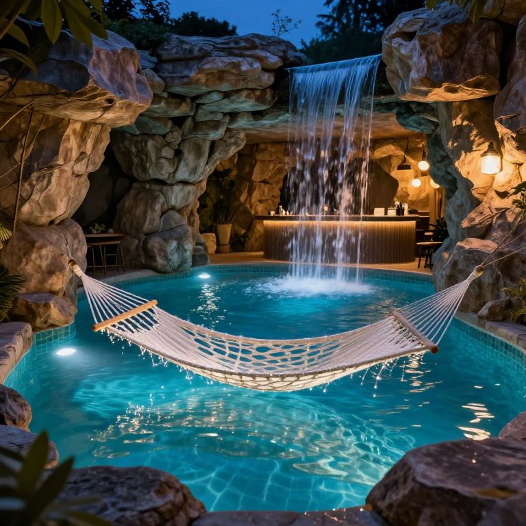 A stunning, ultra-realistic, cinematic swimming pool design at night, featuring natural rock formations, a hammock spanning the water, fiber optic lighting, underwater accent lighting, and a sunken grotto bar behind a cascading waterfall.