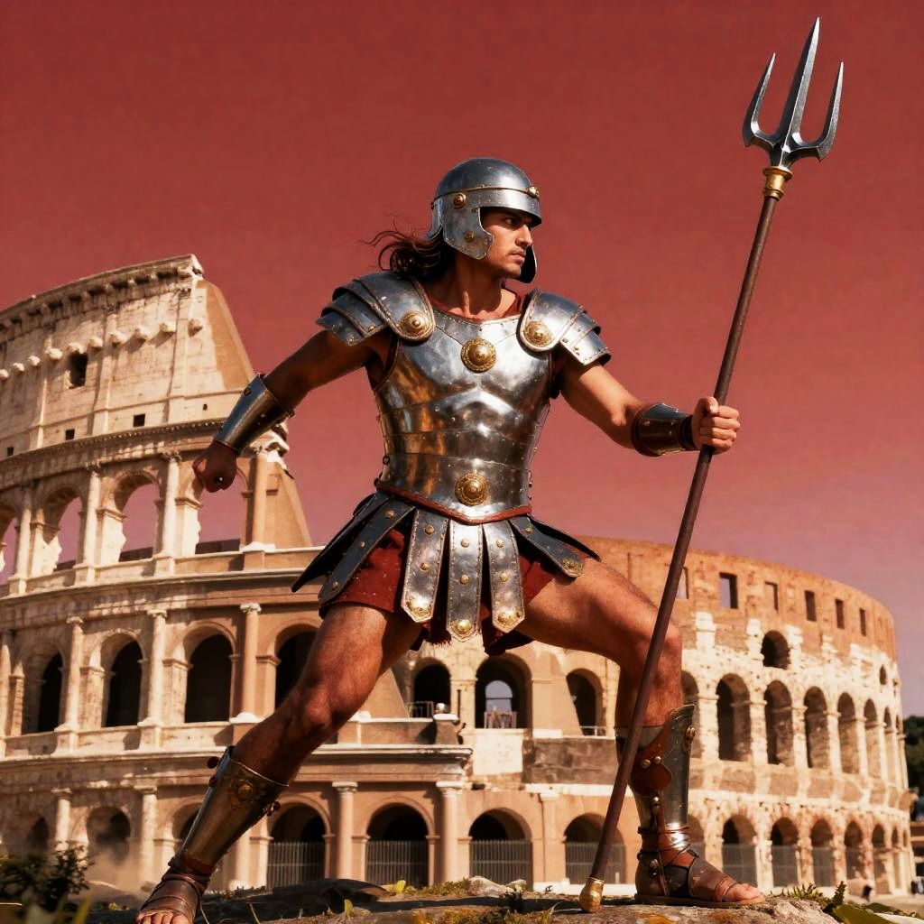 Realistic photo.A powerful courageous gladiator mid-action, wielding barbed trident, with colosseum under a crimson sky, in Amanda Conner's bold and expressive comic book style. realistic photo