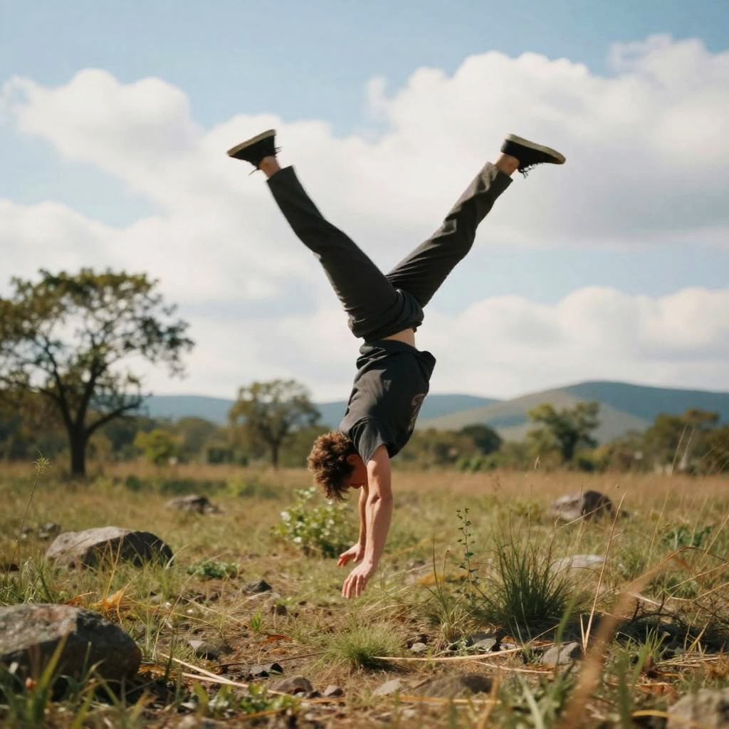 A blurry photograph of a person mid-air, upside down, performing a flip in a grassy, rocky field with sparse trees. The sky is bright with scattered clouds. The person's clothes are dark, and their legs are spread apart. The field has patches of green and brown vegetation, and the background includes distant hills.
