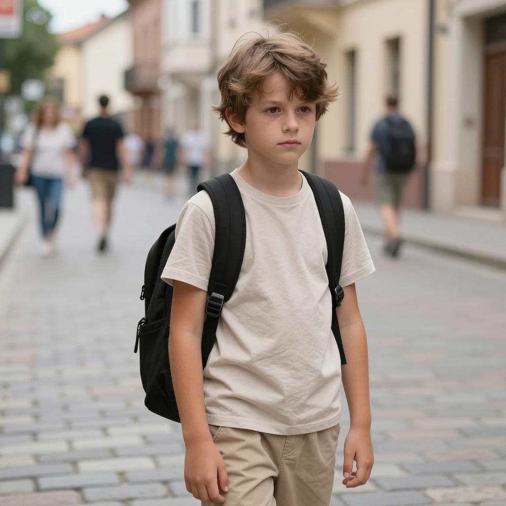 Photorealistic image of a young boy with brown wavy hair wearing a light beige t-shirt and matching beige pants. He carries a black backpack and stands on a cobblestone street during daytime. The boy has a serious expression and casual style. The background shows a cityscape with blurry people walking and out-of-focus buildings under natural light with soft shadows.
