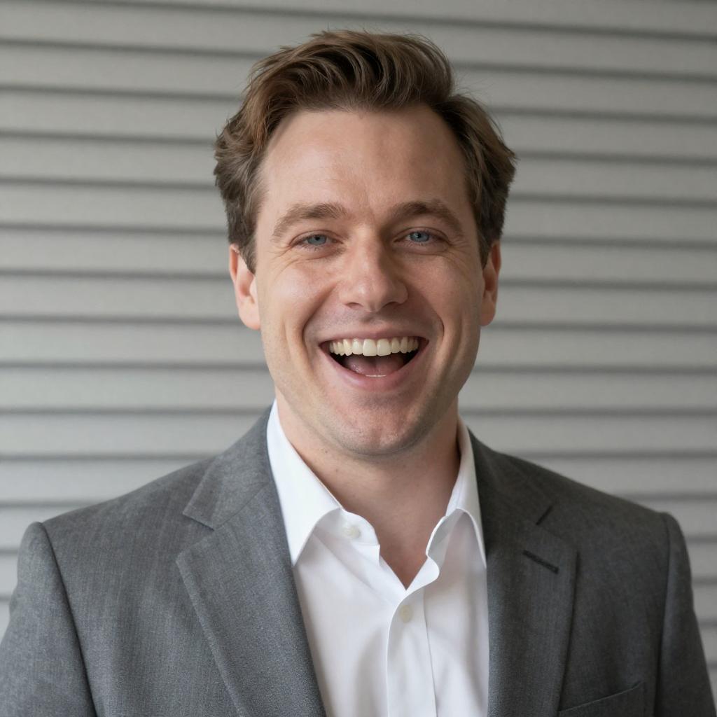 Photograph of a man with fair skin, short brown hair, and a slight smile. He wears a dark coat over a red and black checkered shirt. Background is a blurred, vibrant red autumnal scene. Centered, close-up portrait.