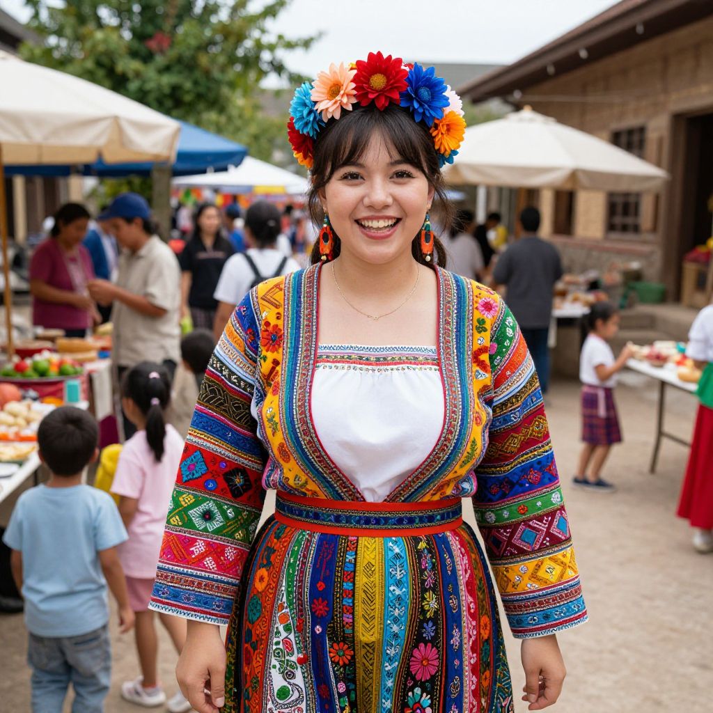 Photograph of a smiling Asian woman with fair skin and black hair, wearing a colorful, traditional Mexican dress adorned with intricate, multicolored patterns and embroidery. She has a vibrant flower crown with red, blue, and orange flowers. The dress features a white square neckline. She is standing outdoors at a market, surrounded by people, including children in casual clothing. The background includes market stalls with fruit displays, white umbrellas, and rustic wooden buildings. The market is bustling with activity, and trees are visible in the distance. The image is bright and colorful, capturing a lively, festive atmosphere.