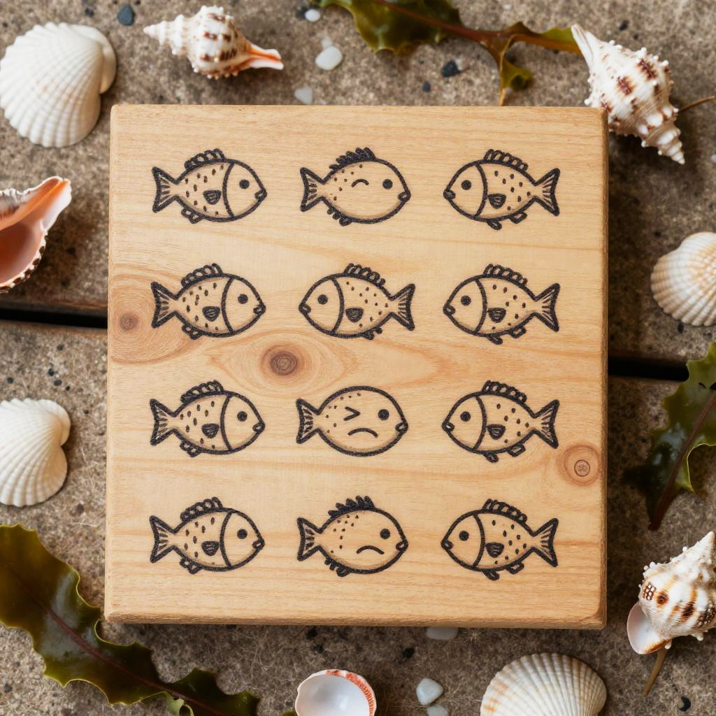 Whimsical Fish Emojis on Wood