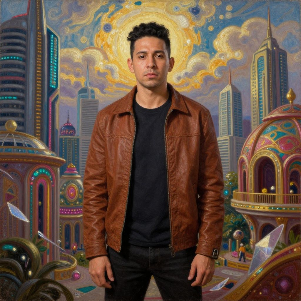(A Hispanic Man caught in a candid photo, raw, staring directly at the viewer), (ored fashion concept portrait:1.33)(acrican cyberpunk ancient dystopian Cozy dwelling with exotic 776 architecture:1.23), witness the skyscrapers around, Portrait hinging between moving shards, dynamic camera design, photoreal: beautiful shadows, cozy color palet tones, vivid colors, complimentary color scheme, grim yet sparkling atmosphere, Dramatic lighting + Golden clouds, Extremely hyper detail Volumetric Cinematic, oil painting, (art By Beckmann Zacurse Bouguereau Ayammad