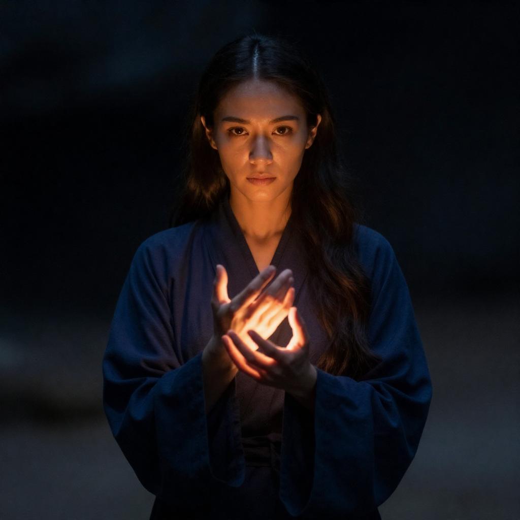 Photograph of a woman with long dark hair, wearing a dark blue robe, standing against a blurred, dark background. She has glowing, orange-yellow light emanating from her outstretched hands, illuminating her serious expression. The light creates a dramatic contrast with her shadowed face and surroundings.