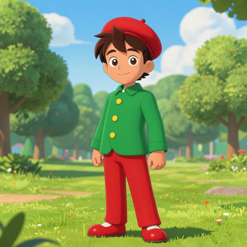 Digital illustration of a young boy standing in a sunny, green park. He has dark brown hair, large brown eyes, and a small smile. He wears a red beret, green button-up shirt with yellow buttons, red pants, and red shoes with white soles. The background features lush green trees, a blue sky with fluffy white clouds, and a grassy field with scattered colorful flowers and a small rock. The boy is centered, with his hands by his sides, and the vibrant colors and cartoonish style give the image a cheerful, playful feel.