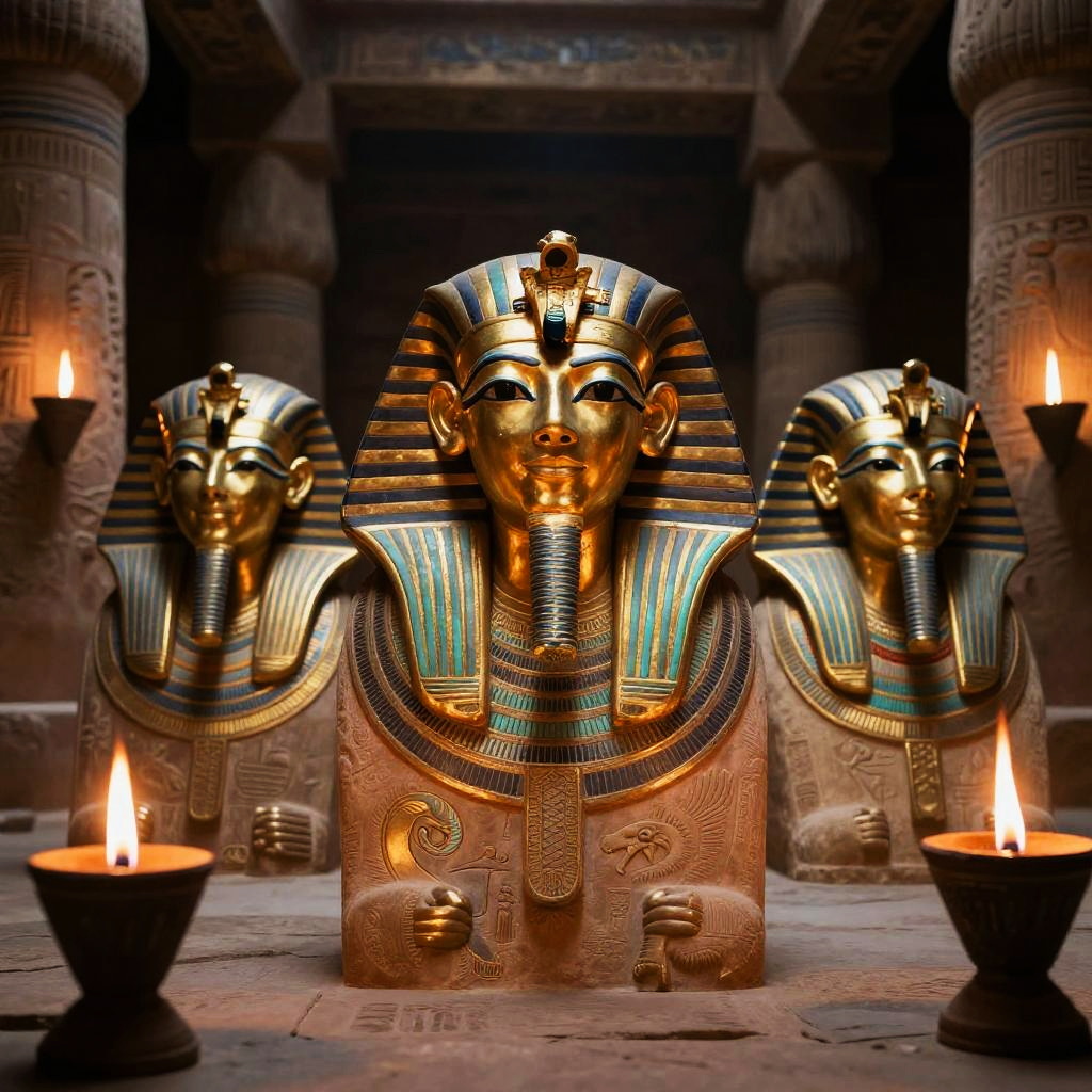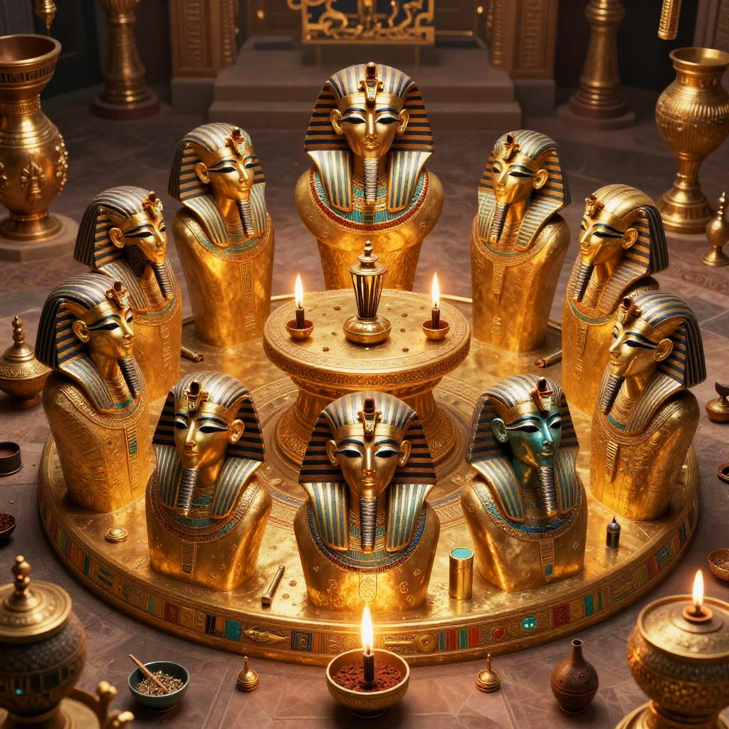 Egyptian god masks arranged in a ceremonial circle on a golden altar, surrounded by burning incense and ancient artifacts, enchanted ambiance, richly colored, hyper-realistic style