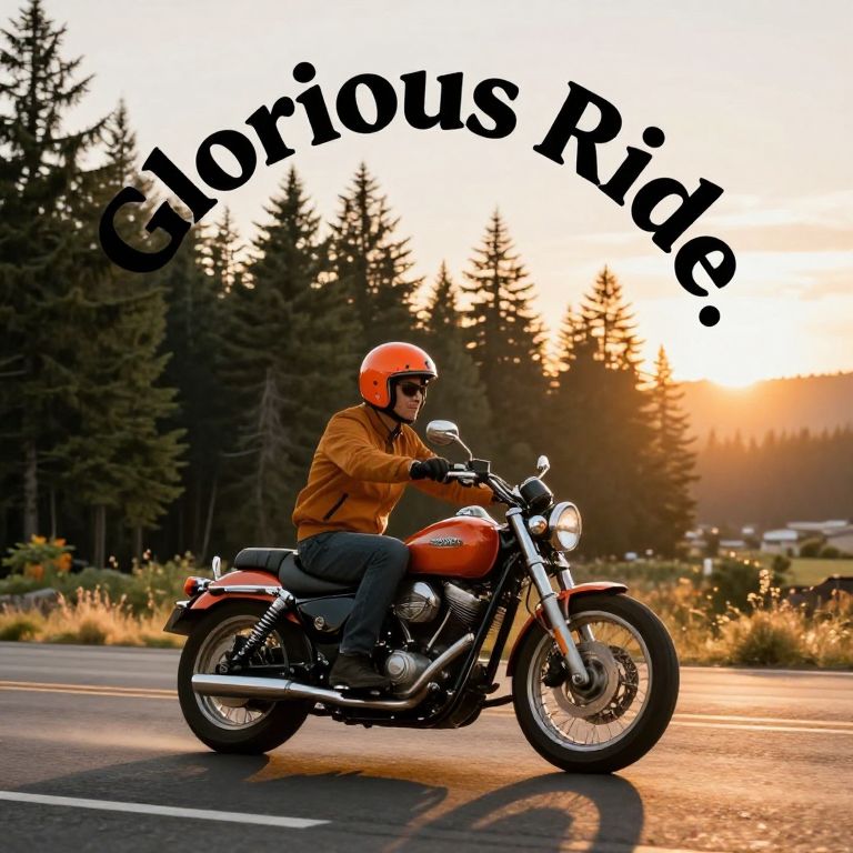 Rider donning a vibrant orange helmet and jacket gracefully maneuvers a classic cruiser motorcycle against a scenic backdrop of towering evergreen trees and a golden sunset, encapsulated within a circular frame that reads \"Glorious Ride.\