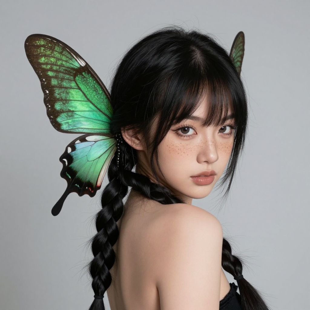 Photograph of an East Asian woman with fair skin and freckles, featuring long black hair in two braids. She wears large, vibrant green butterfly wings on her head, resembling a fairy. Her expression is neutral with slightly parted lips. She is dressed in a black, strapless top, exposing her bare shoulders. The background is a simple, solid light blue, highlighting her as the focal point. The image has a soft, ethereal quality, emphasizing her delicate, fantasy-like appearance. Her makeup is subtle, enhancing her natural beauty. The overall style is whimsical and otherworldly.