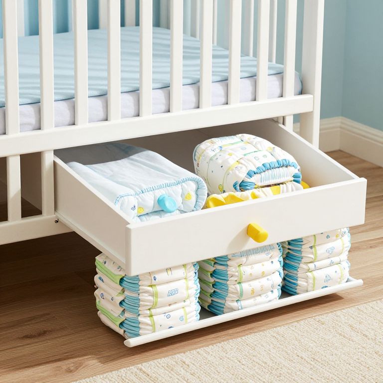 Photograph of a white crib with an under-crib storage unit holding stacks of diapers and a patterned diaper on top.