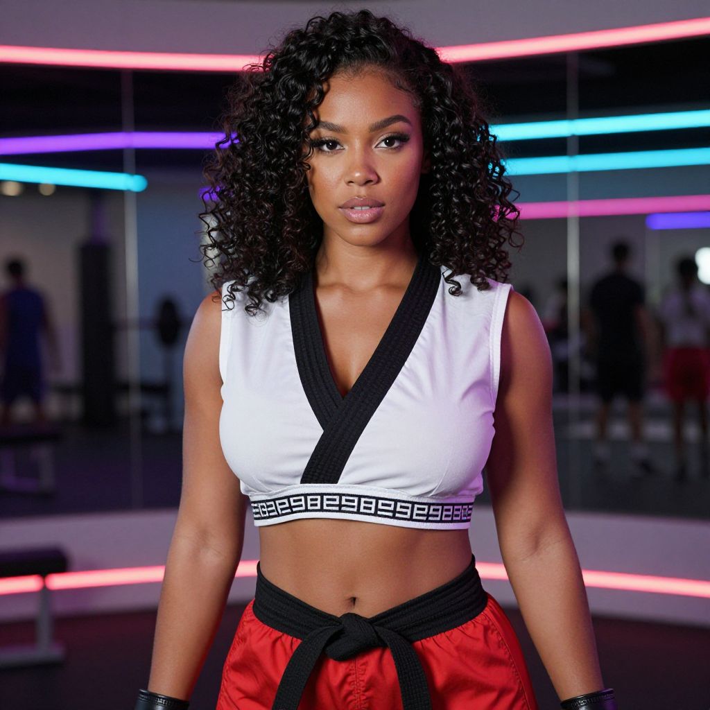 A woman in her late 20s with warm brown skin, curly black hair, and sharp, confident eyes is wearing stylish workout clothes and a bold martial arts-inspired costume in a modern gym setting with mirrored walls and neon lights glowing in the background.. The woman has big breasts and cute face