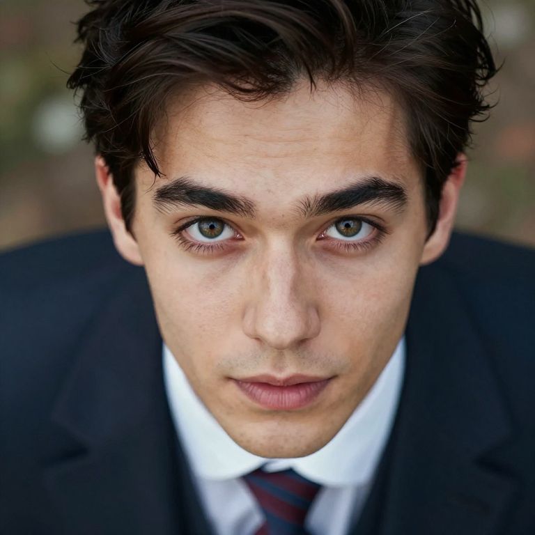 Craft a photorealistic portrait with a classical twist, featuring an individual's charismatic expression captured from an intriguing aerial viewpoint, aligning their visage directly with the viewer's gaze. This unique perspective reveals intricate details of their facial features, hair, and attire amidst a blurred, impressionistic backdrop. The interplay of soft, diffused lighting and a rich color palette evokes a dynamic emotional spectrum, reflecting both confidence and vulnerability in their eyes while accentuating the texture of their skin and subtle micro-expressions. The result is an unforgettable portrait that seamlessly blends traditional and contemporary aesthetics.