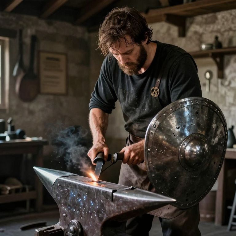 Photograph of a bearded blacksmith with tousled hair, wearing a black shirt, hammering an anvil with sparks, holding a shield-shaped