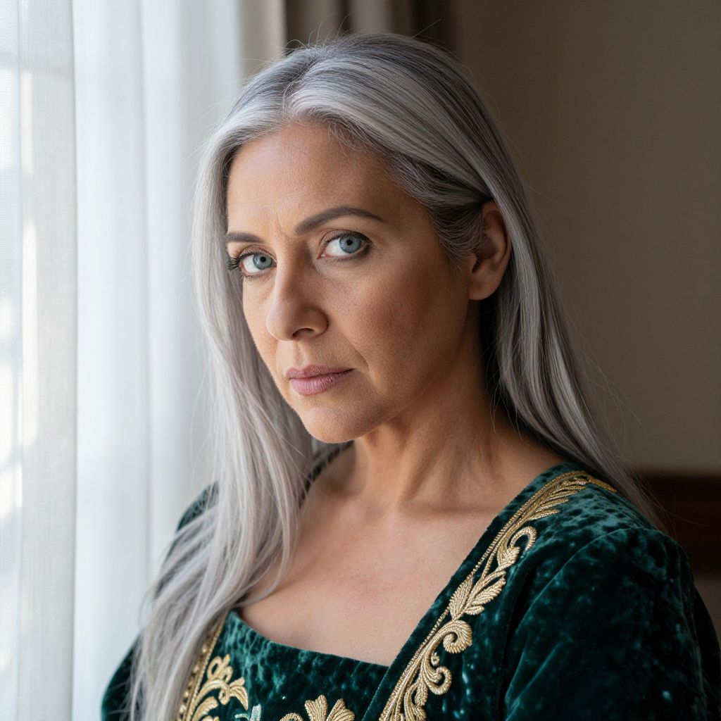 Photograph of a middle-aged woman with long, straight, silver-gray hair and fair skin. She has blue eyes, light makeup, and a serious expression. She is wearing a dark green, velvet-like top with gold embroidery on the shoulders. The background is softly lit with natural light coming from a window on the left. The image has a realistic, natural style with a focus on her face and upper body. The texture of her hair and top is clearly visible, adding depth to the photograph.