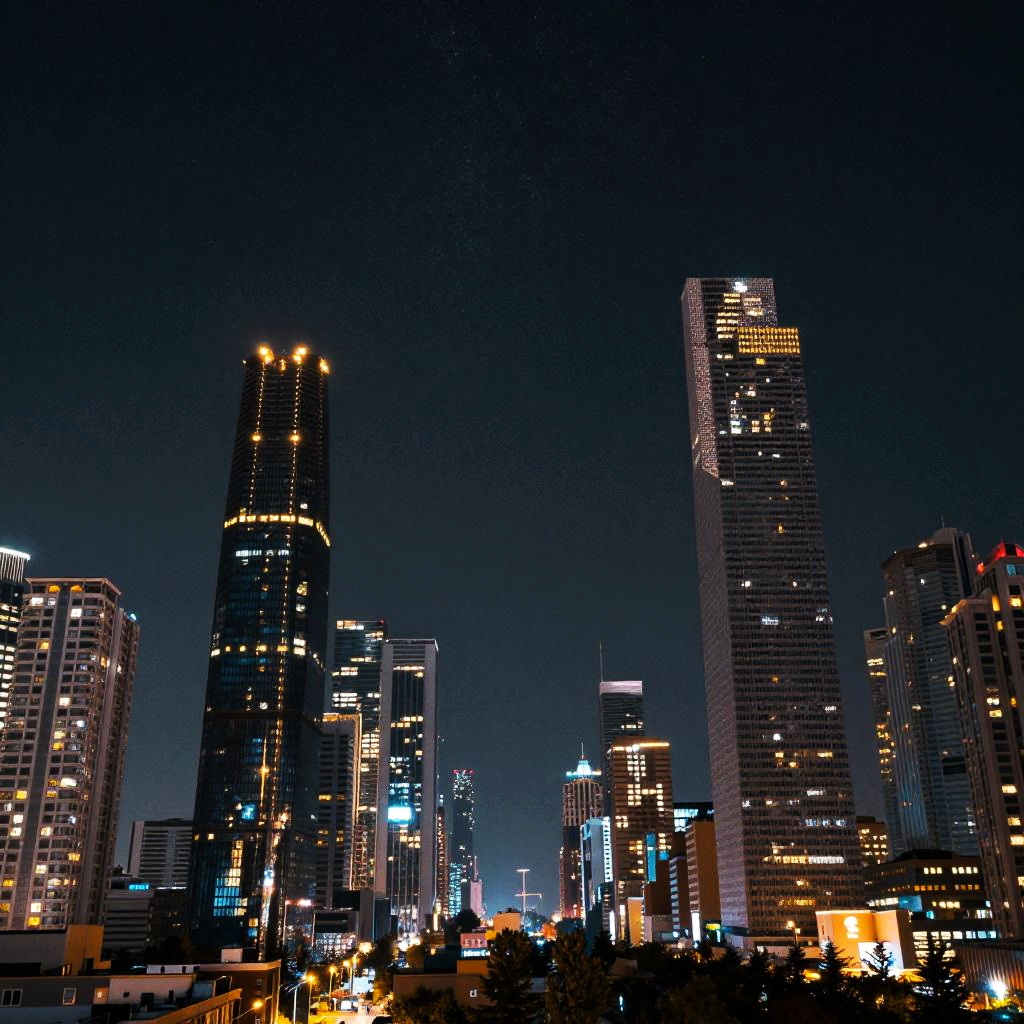 High resolution starry night panorama over a modern city skyline, stars visible above glowing skyscrapers, dark night sky filled with constellations, cool tones mixed with warm city lights, reflecting off glass surfaces, sharp and vibrant, cinematic composition