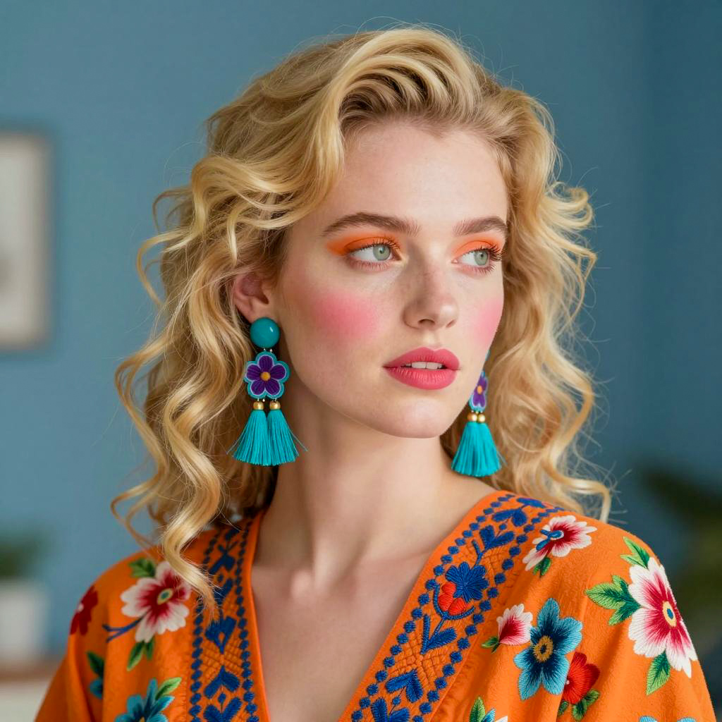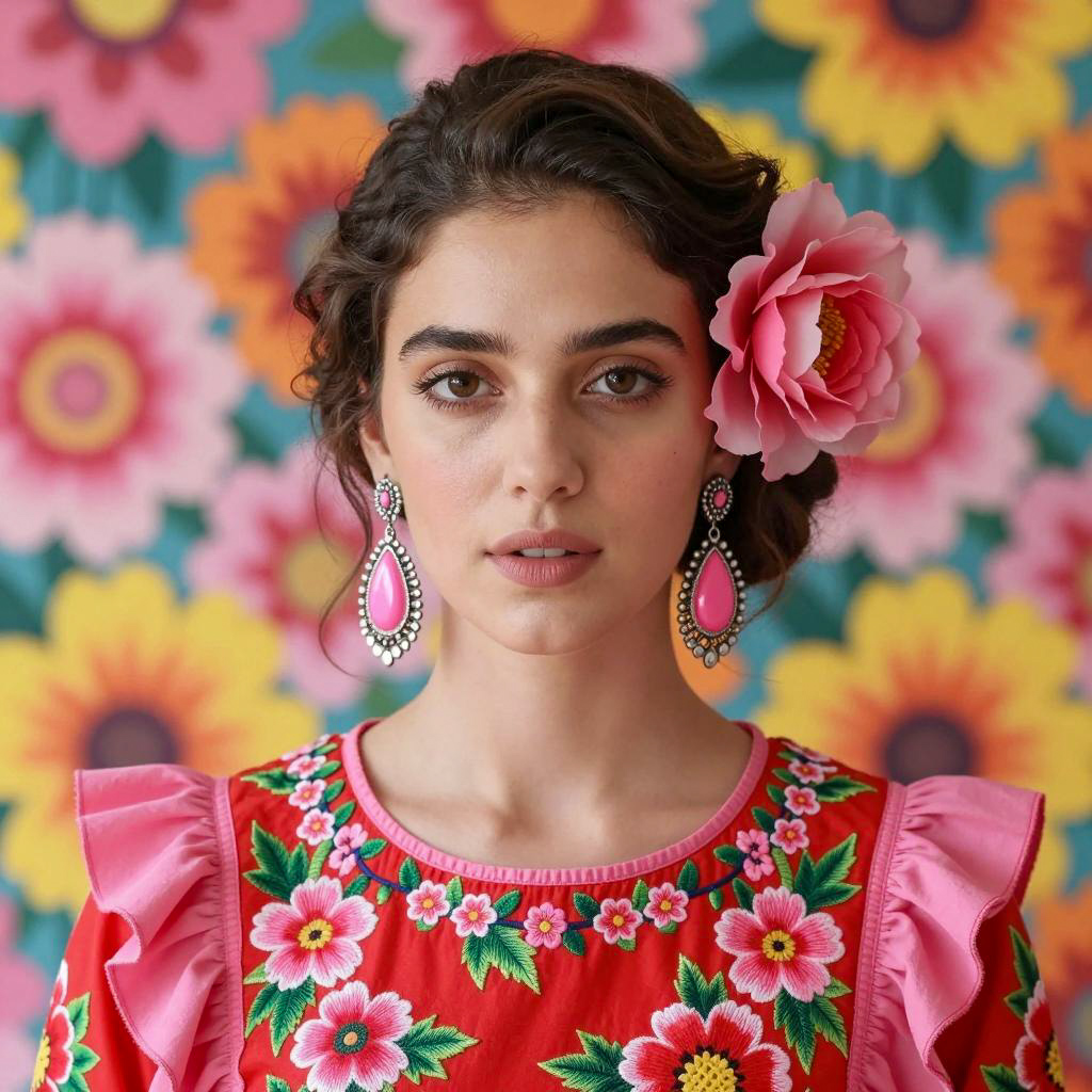 Photograph of a woman with fair skin, dark brown hair in a bun, and a large pink flower on the right side. She wears a bright red floral dress with pink ruffles and intricate pink and green embroidery. Her large, ornate pink and silver earrings hang from her ears. The background is a vibrant, colorful pattern of large flowers in pink, yellow, and orange. Her expression is neutral, with slightly parted lips and intense brown eyes.