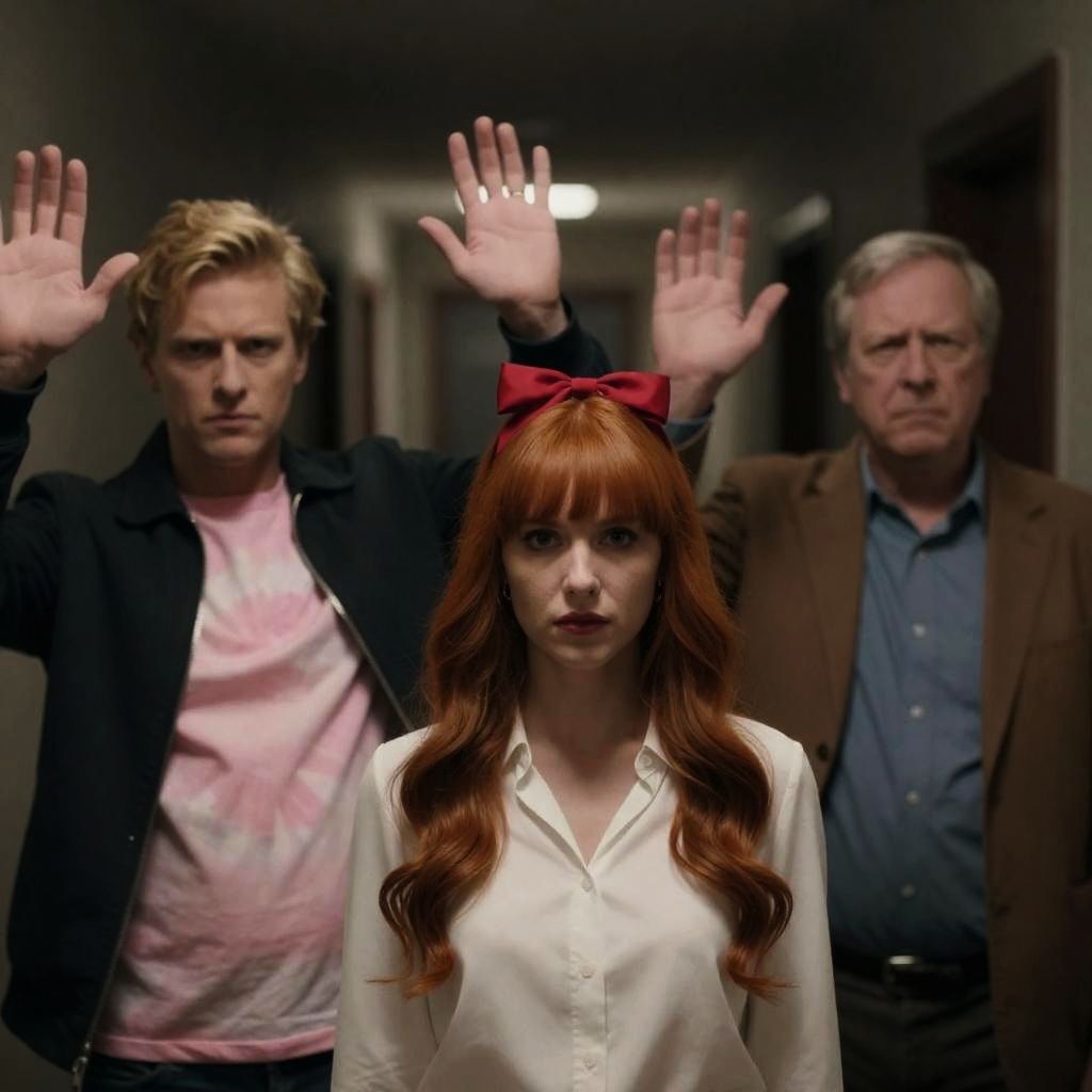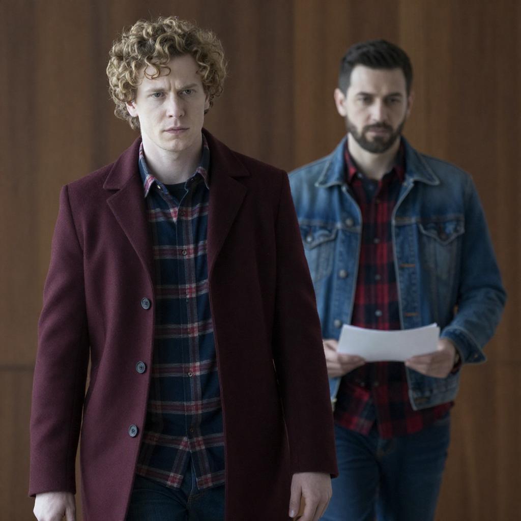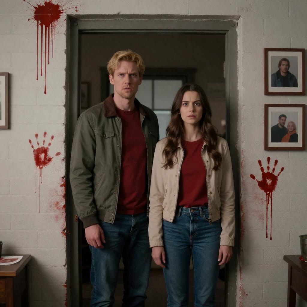 Photograph of a man with curly blonde hair, brown blazer, blue shirt, and jeans standing below an open window. Above, a man with red beard and gray jacket, blood on hand, leans out with intense expression. Ceiling and yellow wall in background. Man below raises hand towards bloodied hand. Two people. Bright lighting.