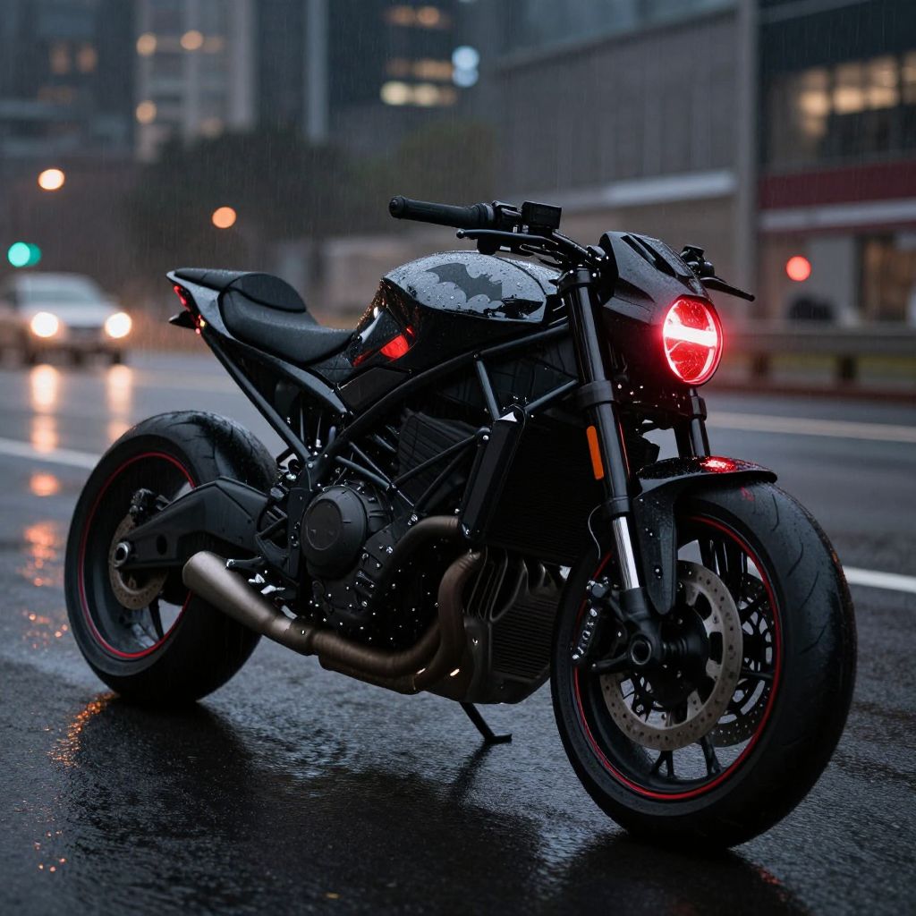 Batman themed motorcycle, high-tech sleek black frame with glowing red eyes on the front, shadowy bat emblem on fuel tank, placed on a rainy highway with reflections of city lights, blending heroic design and urban grit.