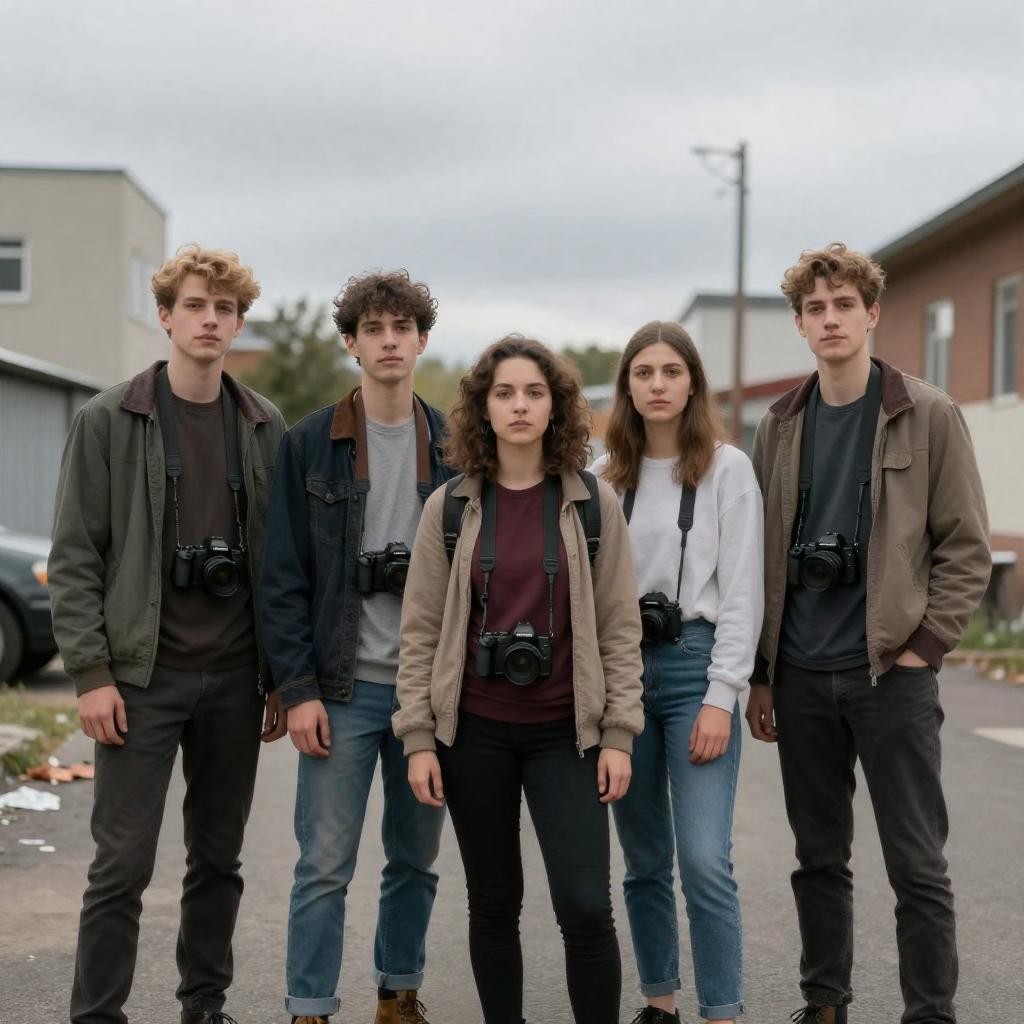 Photograph of five young people walking towards a blonde woman taking a photo with a camera. Eiffel Tower in background. Group in casual clothing, black jackets, jeans, sneakers. Stone statue on left, circular fountain with gold horse sculpture in center. Overcast sky, green trees in background. Blonde woman on right, smiling. Group's expressions neutral. Reflective water in fountain. Red jacket on person in back.