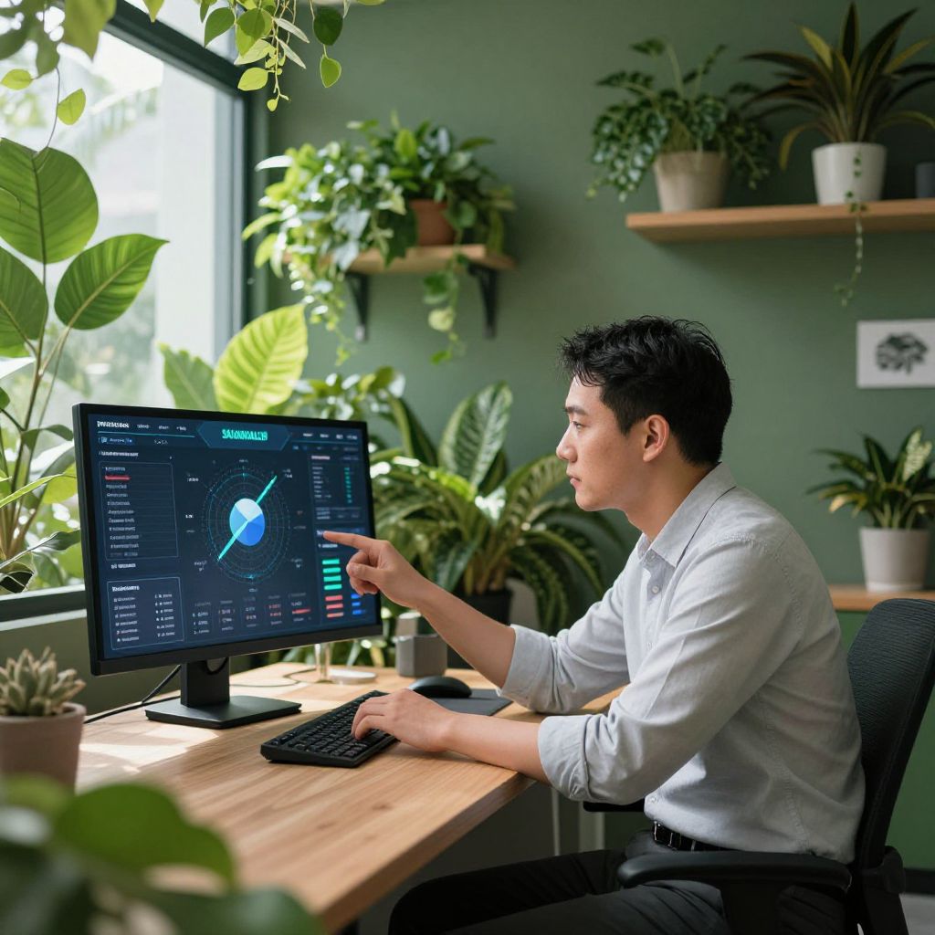 A calm businessman prompt in a green office with biophilic design, surrounded by plants and sunlight, reviewing a digital dashboard, embodying sustainable leadership and mindful business practices.