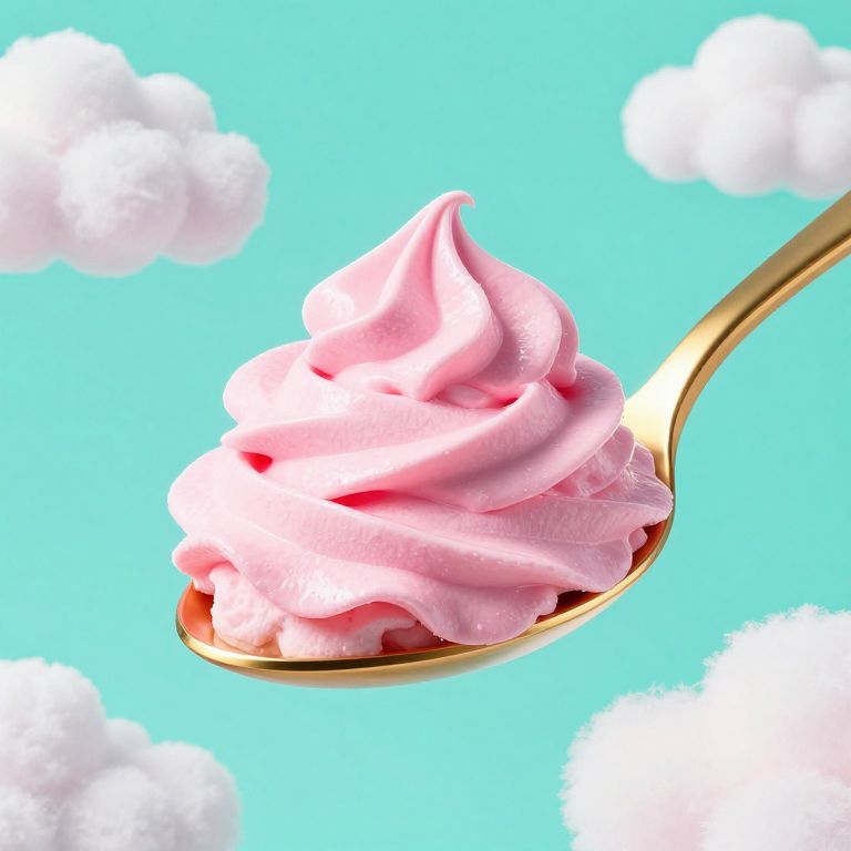 Photograph of a golden spoon holding a swirl of pink whipped cream against a bright, turquoise sky background. The whipped cream has a smooth, creamy texture with soft, rounded peaks. Fluffy white clouds are scattered across the turquoise sky, adding a whimsical, airy feel to the image. The spoon's shiny gold surface contrasts with the pastel pink cream and vibrant blue sky. The overall composition is light and playful, emphasizing the sweetness and delicacy of the whipped cream.