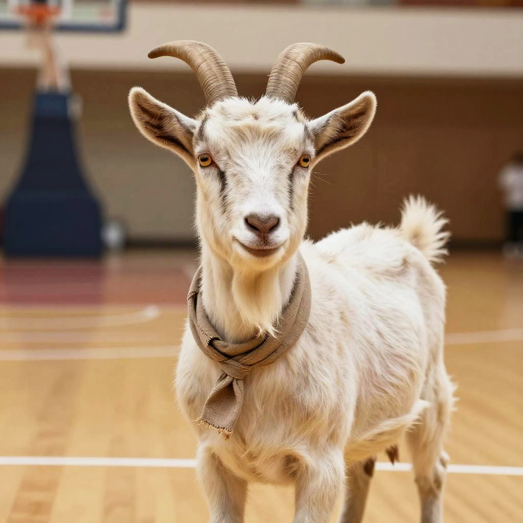Apple Cinnamon A goat with feather-tufted ears, wearing a linen scarf, standing on a basketball court. The scene is regal, emphasizing soft earth tone palette, hyper-detailed, beautifully color-coded, insane details, Unreal Engine, Cinematic Lighting.