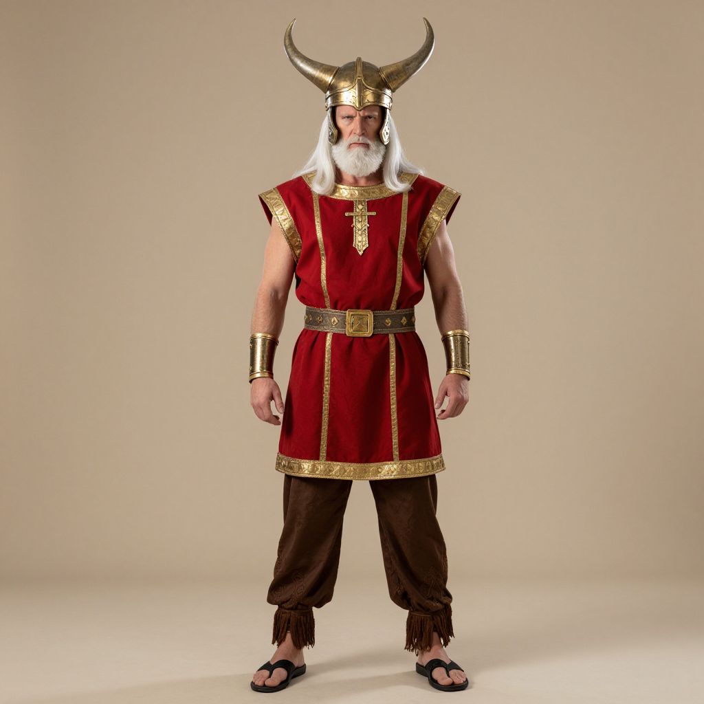 Photograph of a muscular white-bearded man in Roman-style attire, wearing a gold horned helmet, red and gold tunic, brown pants,