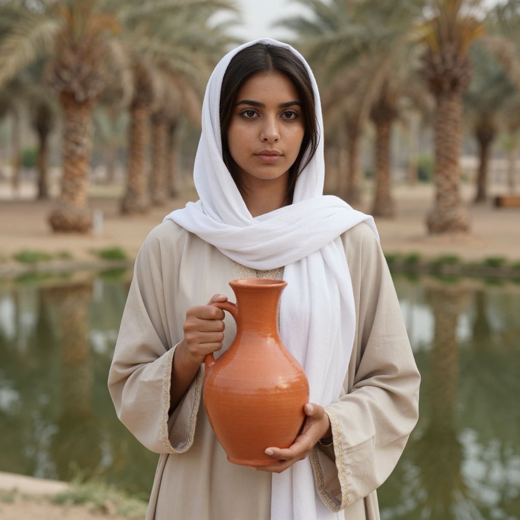 Photograph of a young South Asian woman with medium brown skin and dark hair, wearing a white hijab and a beige traditional long-sleeve top. She holds a terracotta jug with both hands, centered in the image. Her expression is calm and focused. The background features a blurred park with palm trees and a reflective pond. The image has a realistic style with slight digital enhancement, emphasizing the woman and the jug. The overall color palette includes beige, white, and earthy tones. The woman stands out against the soft, natural outdoor setting.