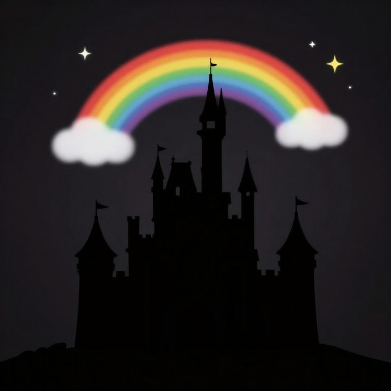 A minimalist black silhouette of a castle with rainbow-colored clouds and stars against a dark background.