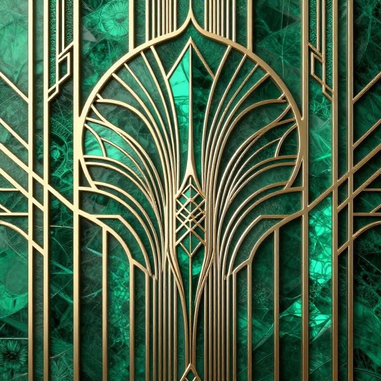 This digital artwork features an intricate, Art Deco-inspired design with golden, geometric lines forming symmetrical, arching patterns. The background is a rich, textured teal with abstract floral motifs, adding depth and contrast. The golden lines converge at a central diamond shape, creating a sense of movement and elegance. The style is reminiscent of vintage architectural details, with a modern, digital twist. The overall composition is balanced and visually striking, blending retro and contemporary aesthetics seamlessly.