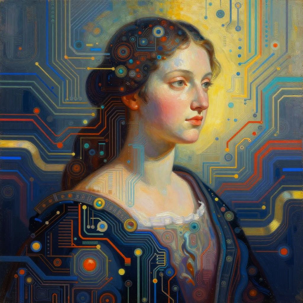 Ai art painting showcasing a futuristic blend of digital and traditional styles, vibrant colors with intricate circuit patterns intertwined with classical brush strokes, surreal and dynamic background emphasizing creativity and technology fusion, high detail