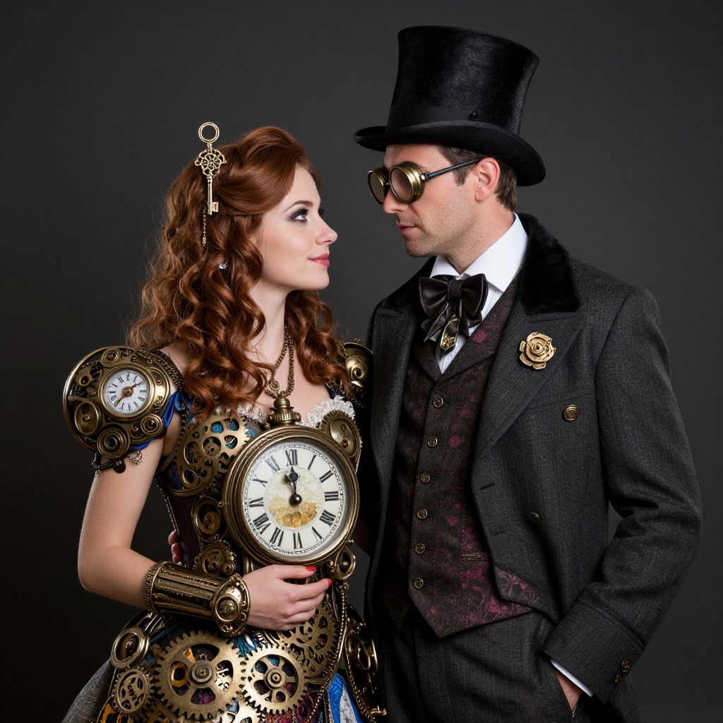 In this captivating image, a couple is depicted in a fusion of romanticism and steampunk styles. The woman, adorned with intricate metal gears and a large, ornate clock, exudes an air of elegance and mechanical sophistication. Her hair, styled in loose waves, is accentuated with a key-shaped accessory, adding a whimsical touch to her appearance. The man, dressed in a Victorian-era suit with a top hat and goggles, complements her with a sense of adventure and innovation. The interplay of their attire, with its metallic and mechanical elements, creates a harmonious blend of the past and the future. The overall composition is balanced, with the couple standing close together, their gazes meeting, suggesting a deep connection. The background is dark and muted, allowing the vibrant colors and textures of their clothing and accessories to stand out, drawing the viewer's attention to the intricate details of their attire.