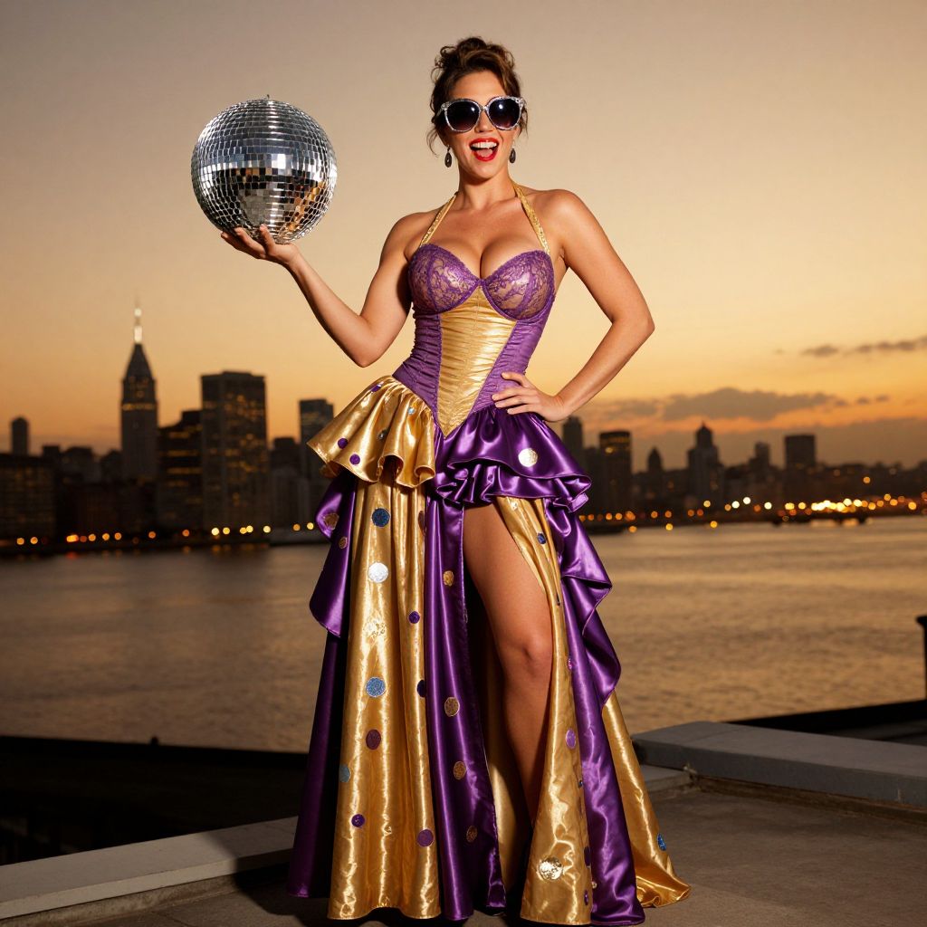 A tall, elegant disco woman in a full costume featuring shimmering gold and purple satin layers, fitted with a lace bodice, flowing skirt with metallic polka dots, and oversized disco sunglasses, standing on the edge of a rooftop party with city lights reflecting in the water backdrop, her face glowing under the warm, golden-hour disco lights, wearing a playful grin and holding a silver disco ball in one hand.. The woman has big breasts and cute face