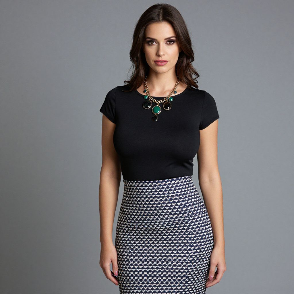 "Woman, business casual, black blouse with short sleeves and round neckline, knee-length pencil skirt with blue and white geometric pattern, statement necklace with green and black stones.. Sexy. Pretty face and beаutiful eyes. Big breasts."