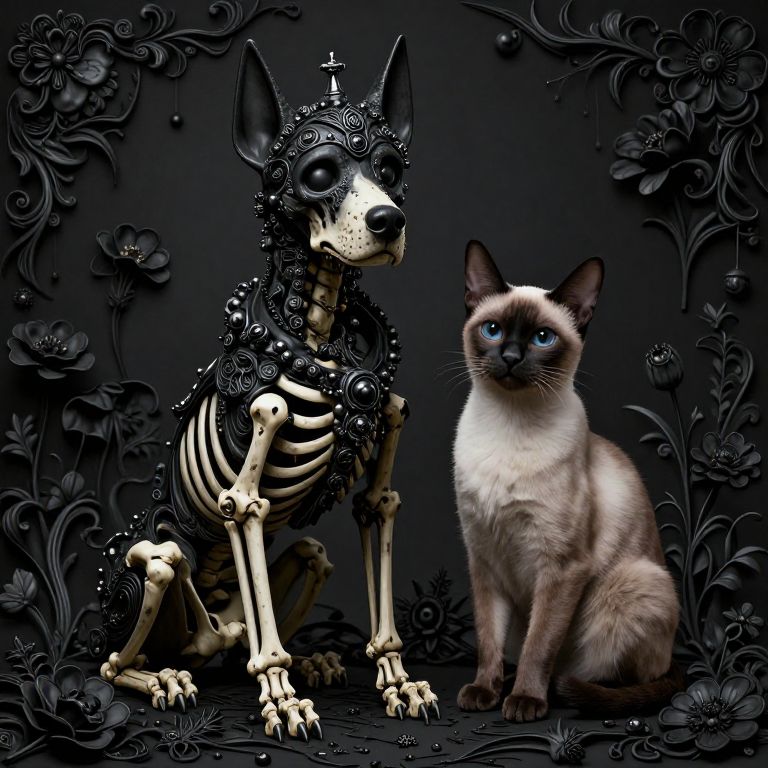 A detailed, hypermaximalist, black and ornate depiction of a zombie dog skeleton sitting next to a Siamese cat skeleton, surrounded by flowers and intricate details, creating a haunting and eerie atmosphere.