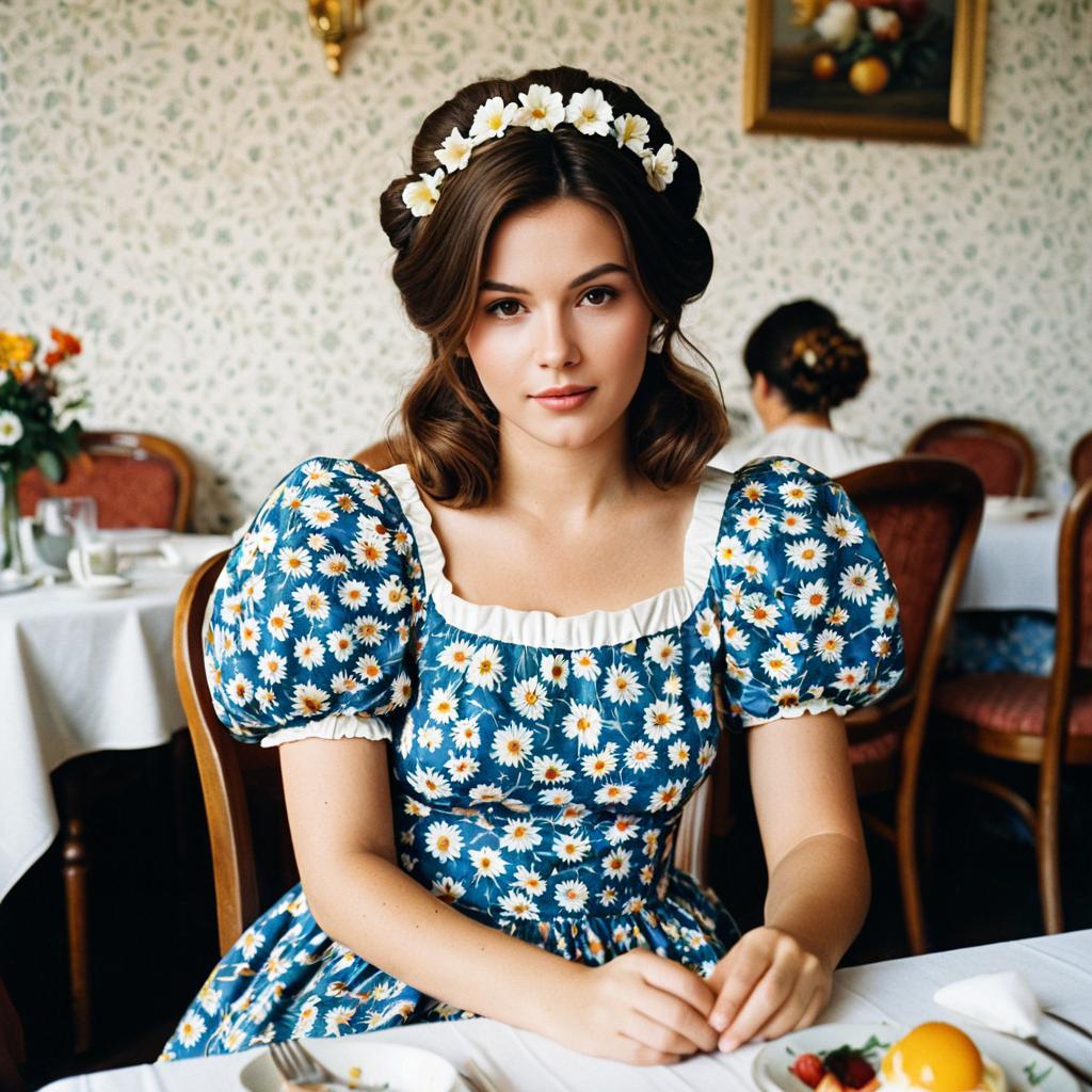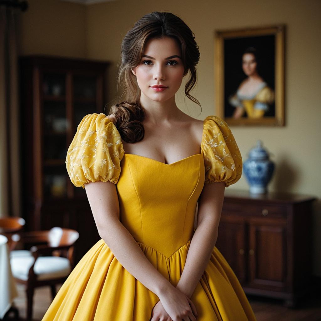 Portrait of a young woman with brown hair and brown eyes wearing an elegant yellow belle-style dress with puffy embroidered sleeves. She stands indoors in a softly lit room with classic wooden furniture and a framed portrait in the background, looking directly at the viewer with a calm expression.
