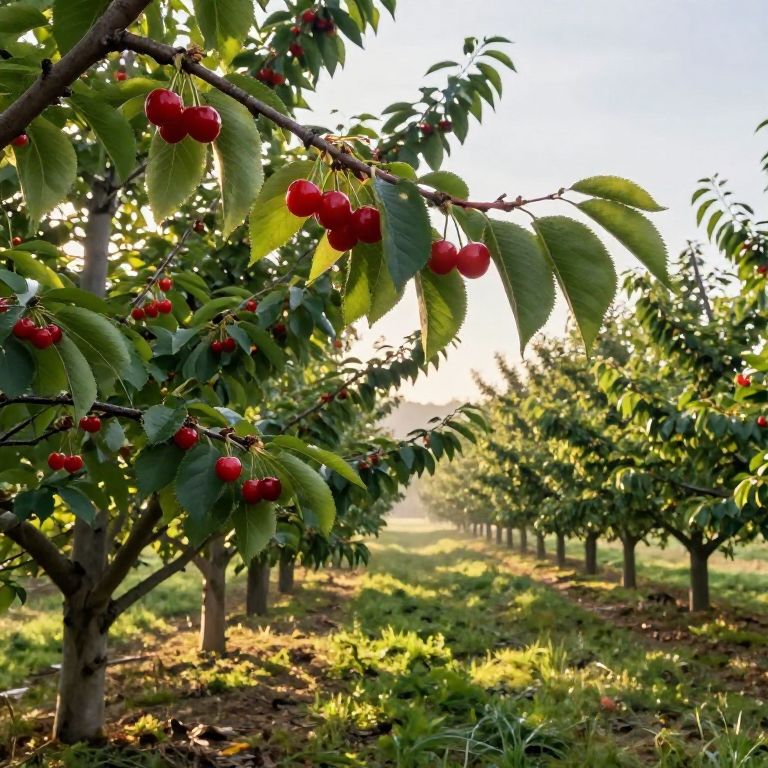 Photograph of a sunlit cherry orchard with vibrant red cherries hanging from lush green leaves, rows of trees stretching into the background, and sunlight