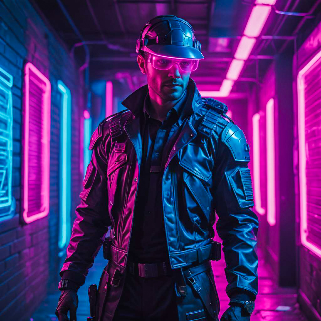 Detective outfit, worn by cyberpunk sleuth, featuring slick body armor and neon-lined visor, in blacklight pink and electric blue, captured in moody film noir aesthetic.