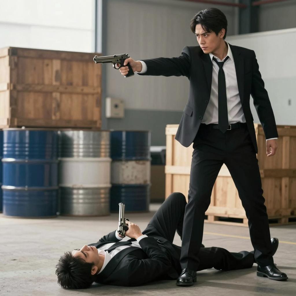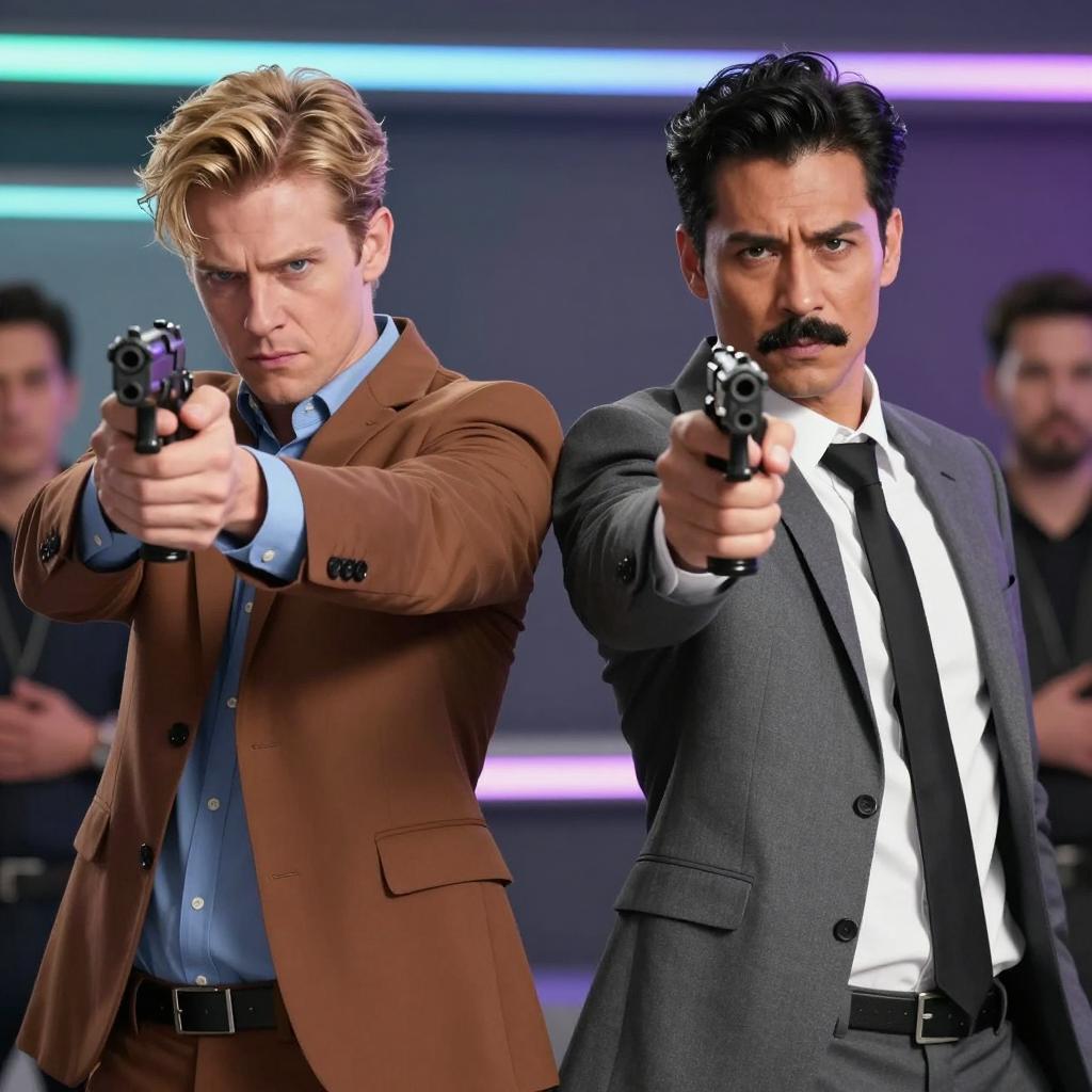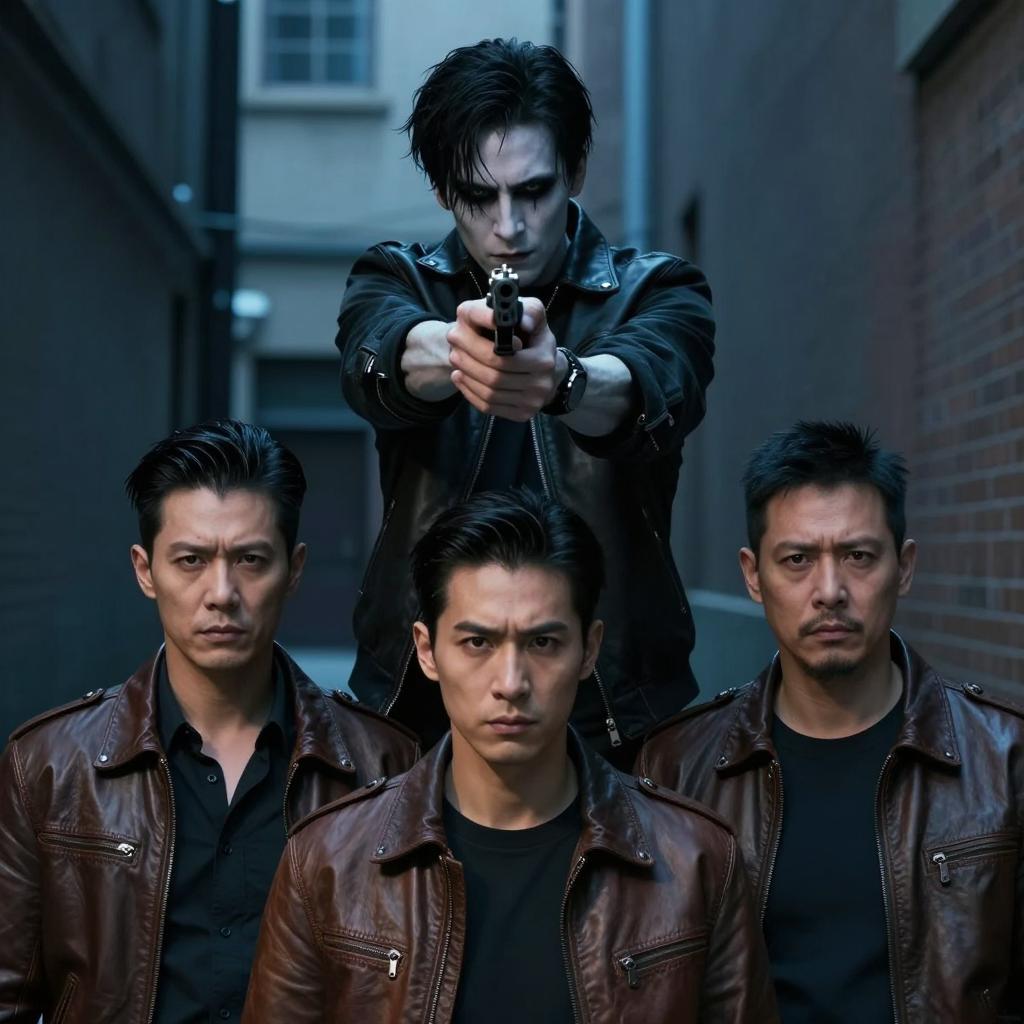Photograph of four men in a dark, blue-lit alleyway. Upper man with pale skin, dark hair, aiming gun downward. Three men below, serious expressions, brown leather jackets. Background features tall building walls with vertical lines. Upper man's gun is pointed forward, others look directly at camera.