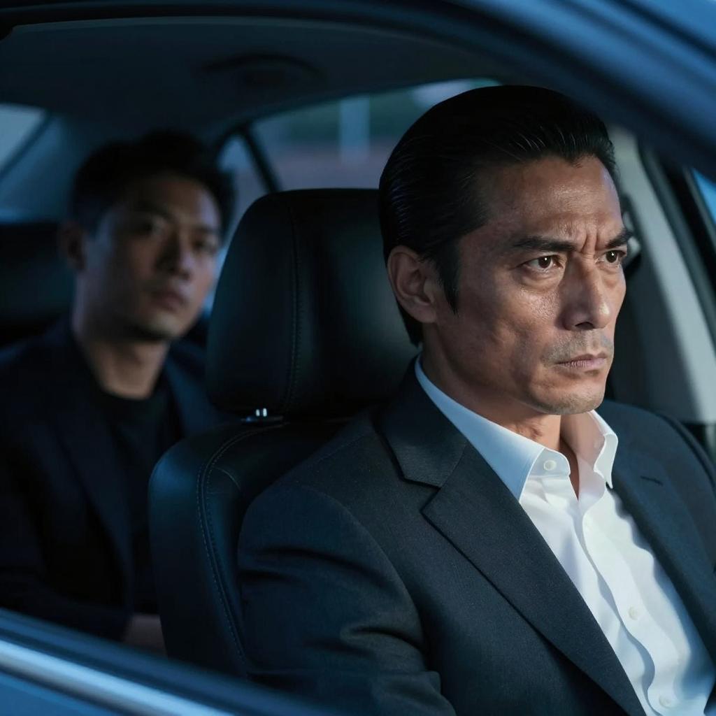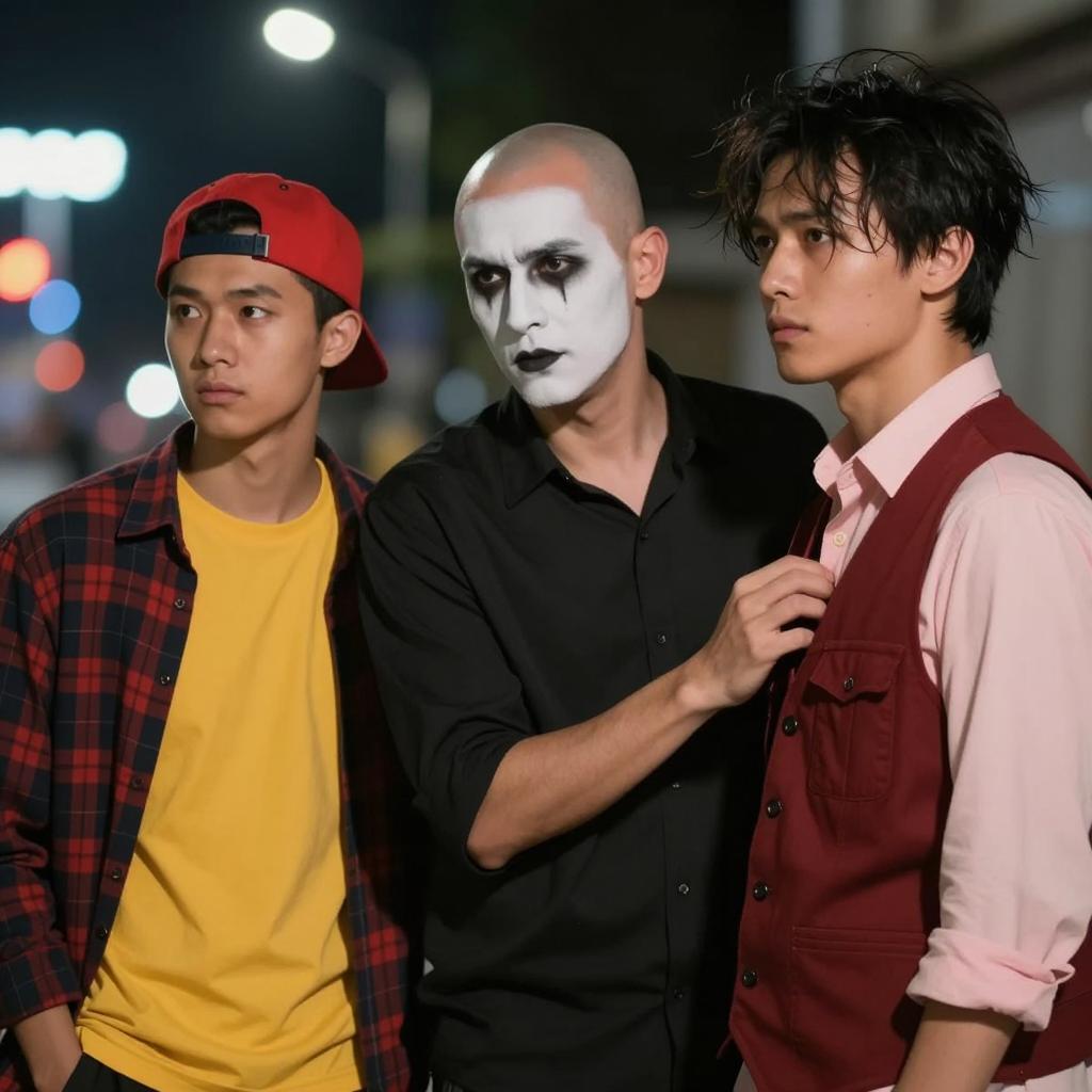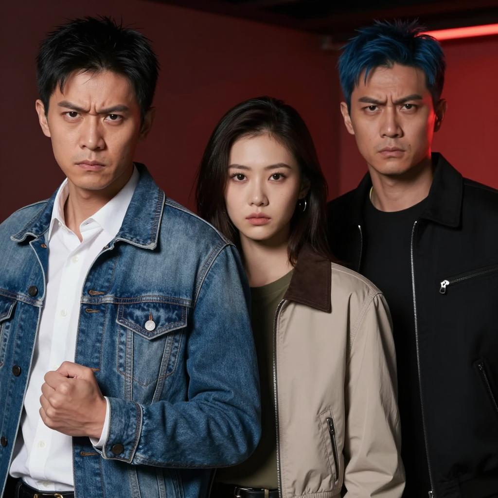 Photograph of four men in a dark, blue-lit alleyway. Upper man with pale skin, dark hair, aiming gun downward. Three men below, serious expressions, brown leather jackets. Background features tall building walls with vertical lines. Upper man's gun is pointed forward, others look directly at camera.