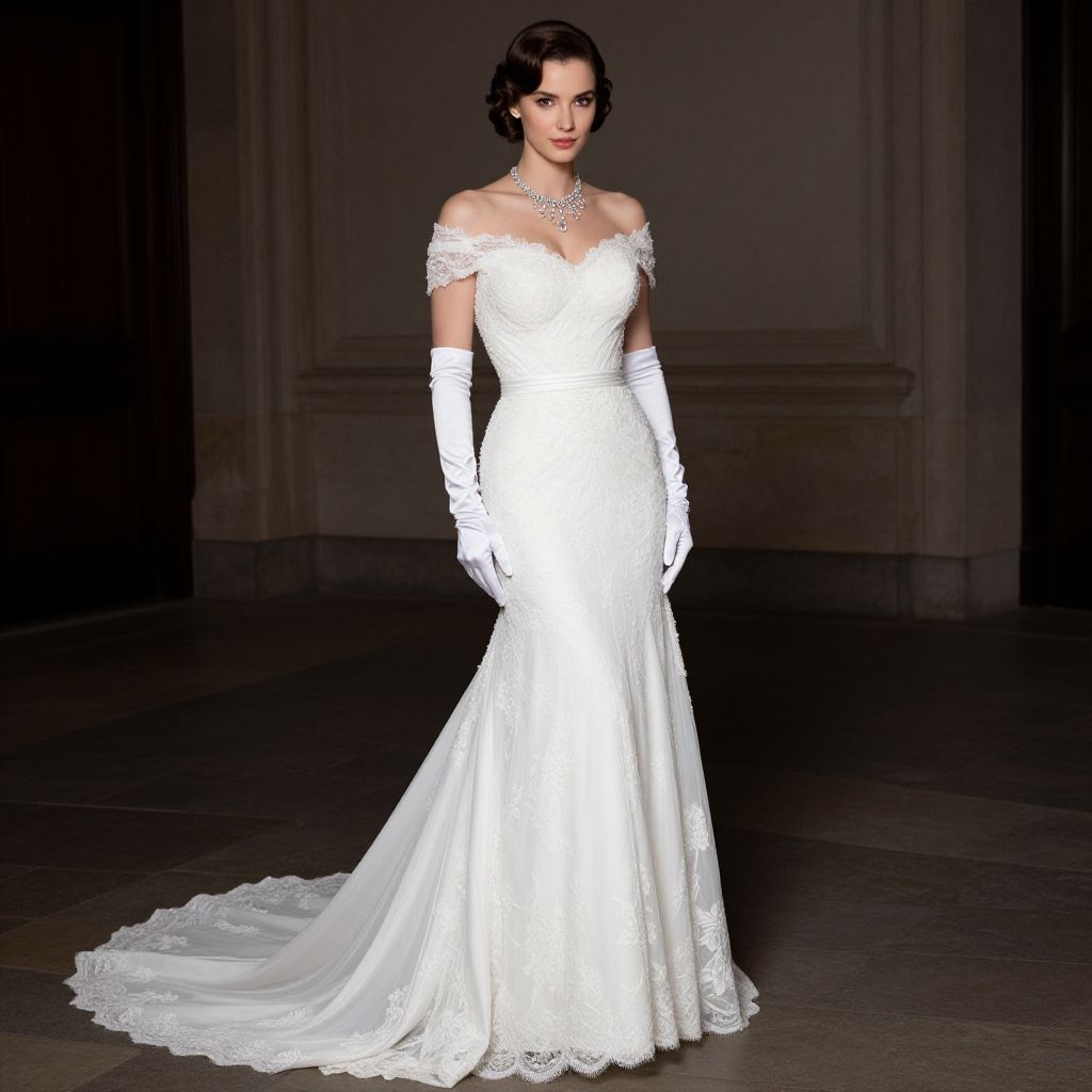 Photograph of a fair-skinned woman with dark hair styled in an elegant updo, wearing a strapless, white, sweetheart-neckline, knee-length tulle dress with lace detailing on the bodice. She has red lipstick and is adorned with white lace gloves, dangling earrings, and gold clutch in her right hand. She stands against a plain beige background, wearing strappy, nude high-heeled sandals. Her confident, poised stance and classic, glamorous look evoke a vintage, Old Hollywood style. The image has a soft, warm lighting that highlights the dress's delicate texture and the subject's refined appearance.