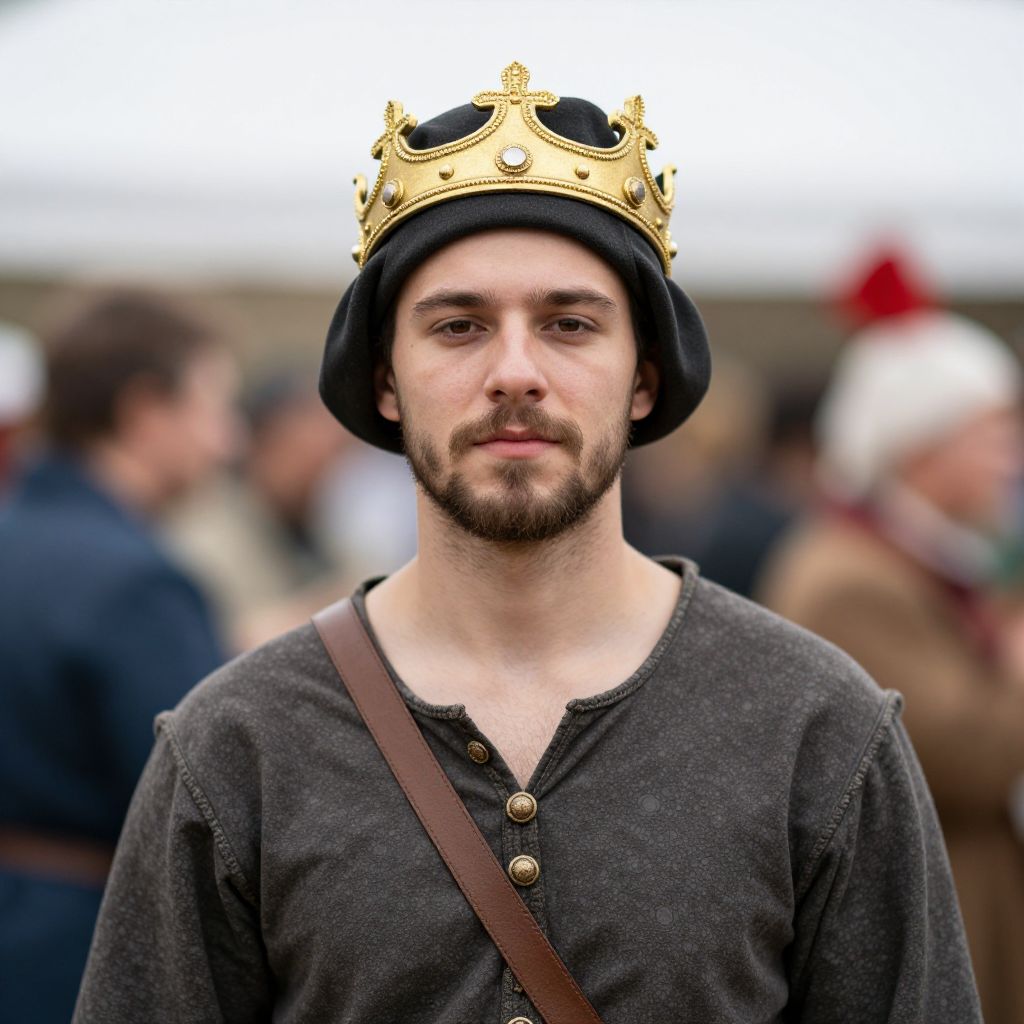 Photograph of a bearded man with fair skin, wearing a black medieval-style hat with a gold crown, gray shirt, brown strap, and blurred