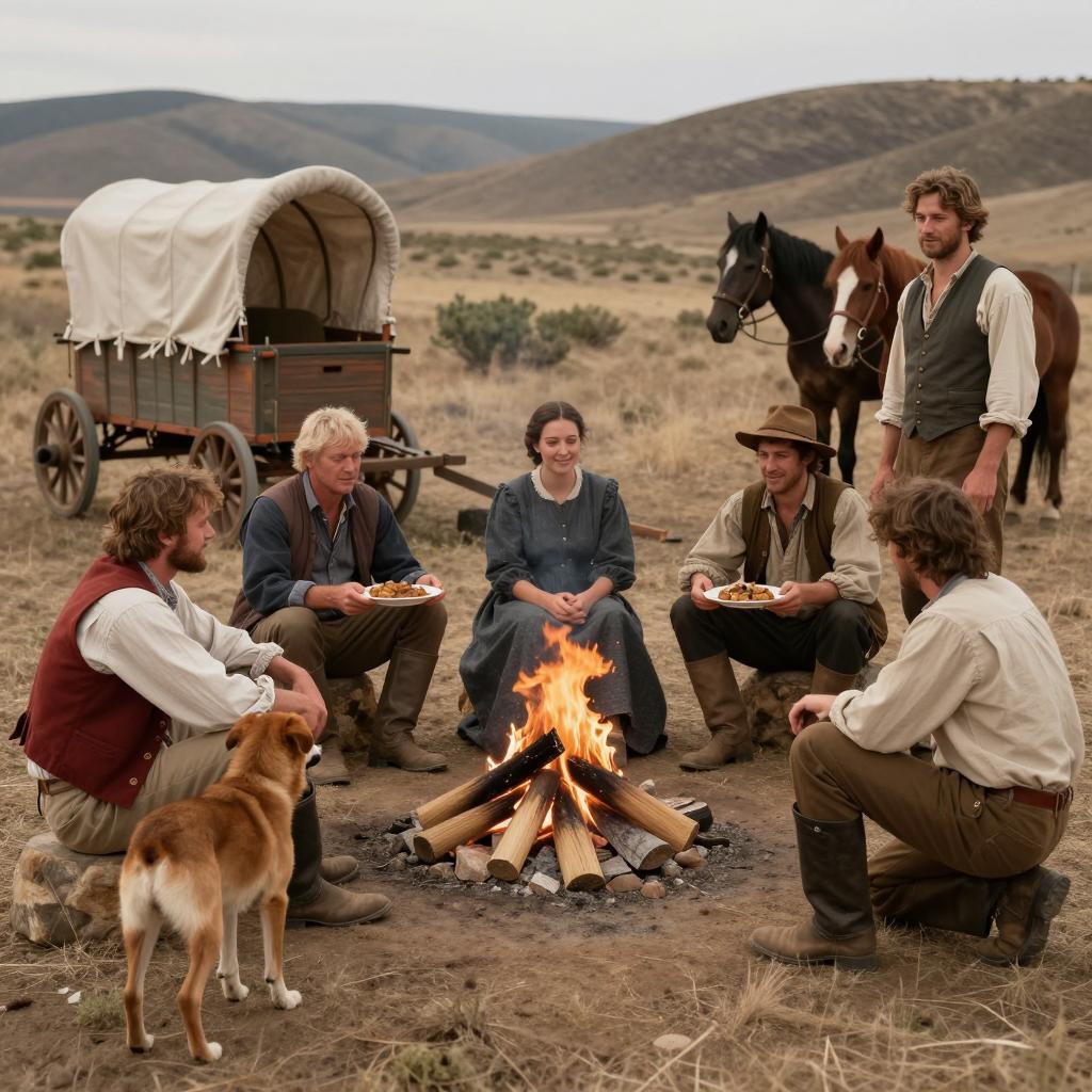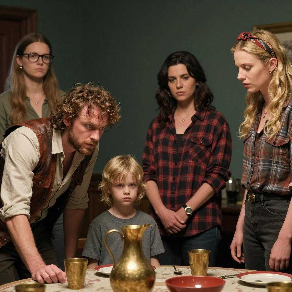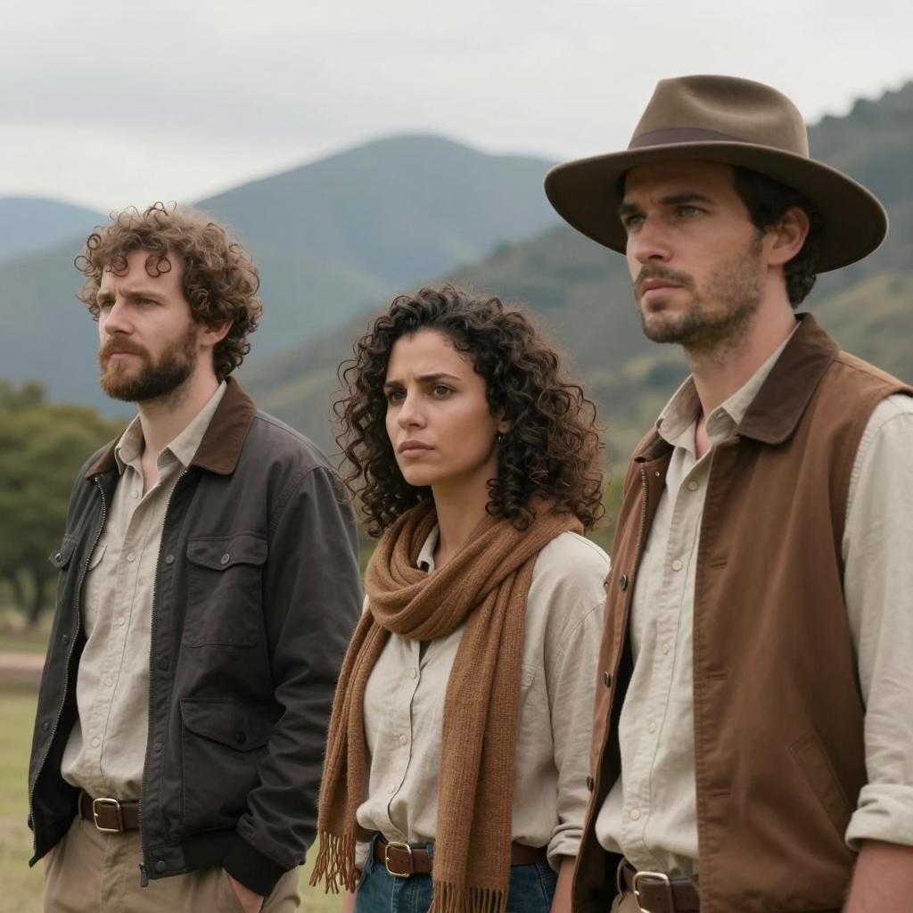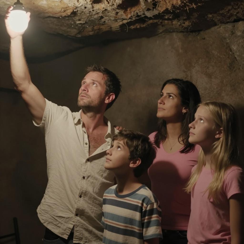 Three people in a stone tunnel with a blue sky background. A man in a hat and beige shirt leans forward, holding a flame close to a woman with curly hair and a serious expression. A blonde child with a vest and shirt leans on the stone ledge, looking down. The flame is bright orange and yellow. The man's arm is raised to the right. The stone walls are rough and dark. The woman's right hand rests on the child's shoulder. The child's eyes are closed.