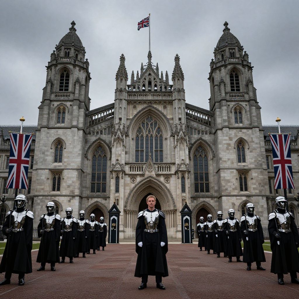 Terry Richardson photorealistic, monumental neo-Gothic building, bleak future, British flags, grand, moody, dark tones, British Royal guards in futuristic armour, statesmen in robes,