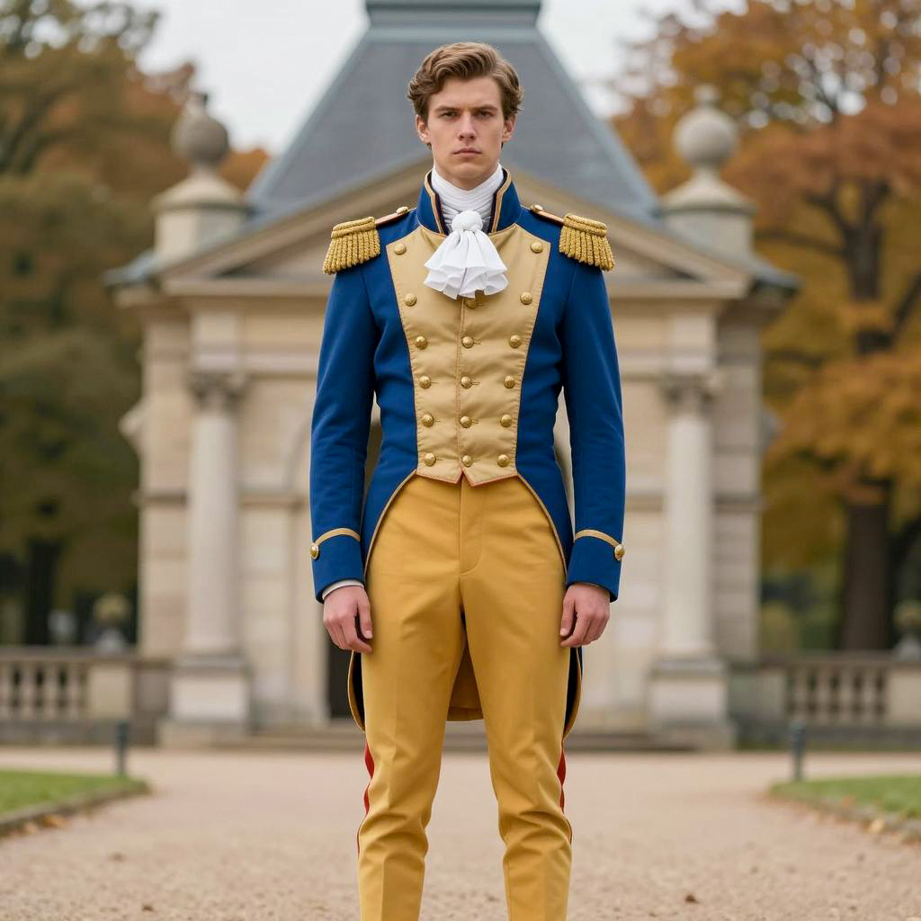 Prince charming costume man, photorealistic, young white man, standing, front view, full body, fancy historical military outfit, blue and gold coat with gold epaulettes, white cravat, mustard yellow pants, serious expression, short brown hair, fair skin, blurry autumn background, stone building with triangular roof in background, symmetrical composition, detailed clothing ures, natural light, symmetrical tree foliage, classical architectural style, realistic proportions, realistic shadows, high quality, portrait orientation