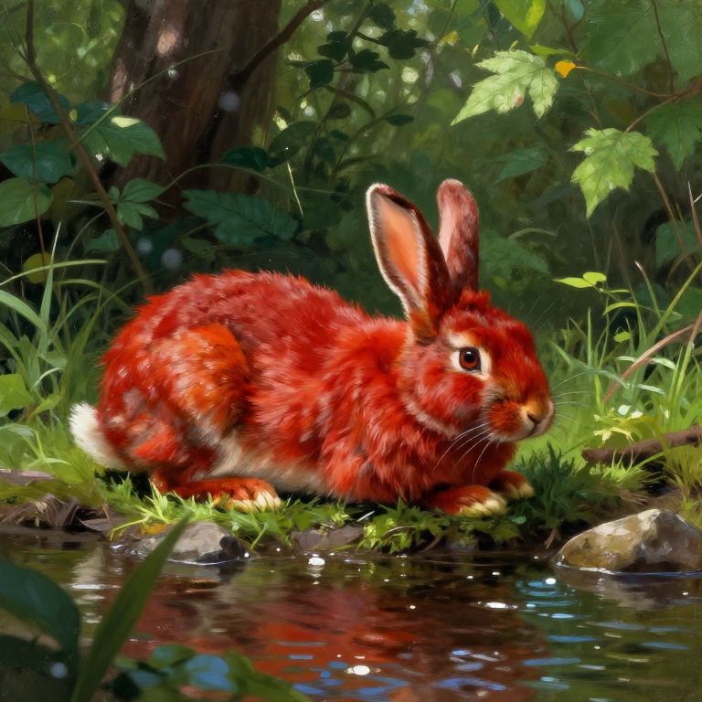 A vibrant digital painting of a red rabbit with lush, fluffy fur and large, upright ears, sitting by a small, reflective stream in a dense forest. The rabbit's fur is a rich, warm red with white patches on its chest and paws. Bright sunlight filters through the green foliage, casting dappled shadows on the rabbit and the grassy, rocky bank. The background is filled with dense, green leaves and tall trees, creating a serene, natural woodland setting. The stream in the foreground reflects the rabbit and surrounding greenery, adding depth to the scene.