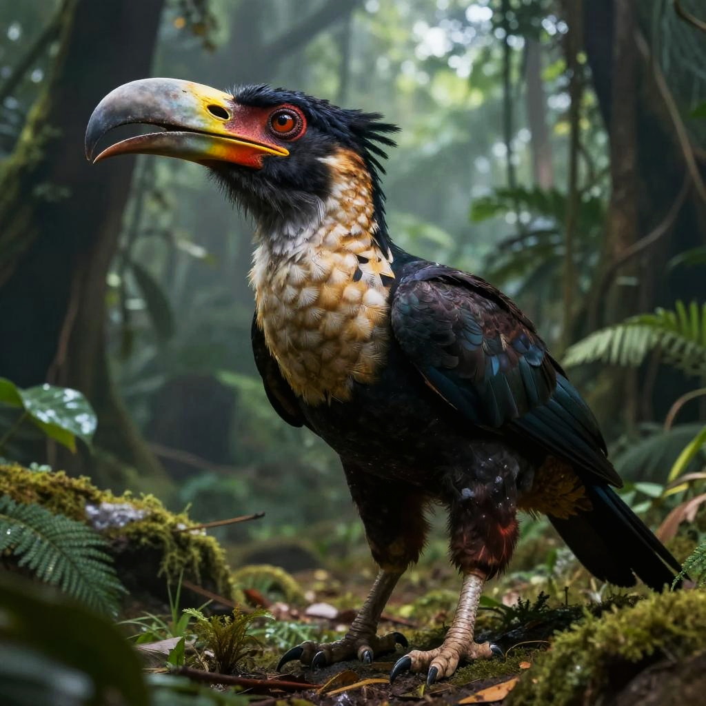 Razor beak of a fierce prehistoric bird, ancient jungle environment with dense foliage and mist, aggressive stance ready to strike, vivid textures on the beak and feathers, dynamic action shot, fantasy realism, vibrant colors and deep shadows